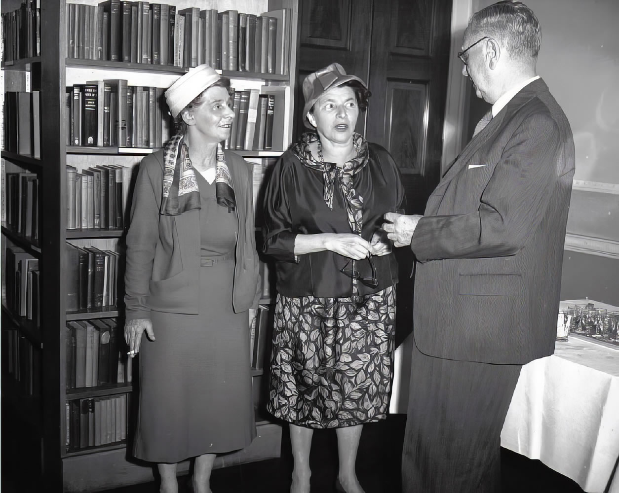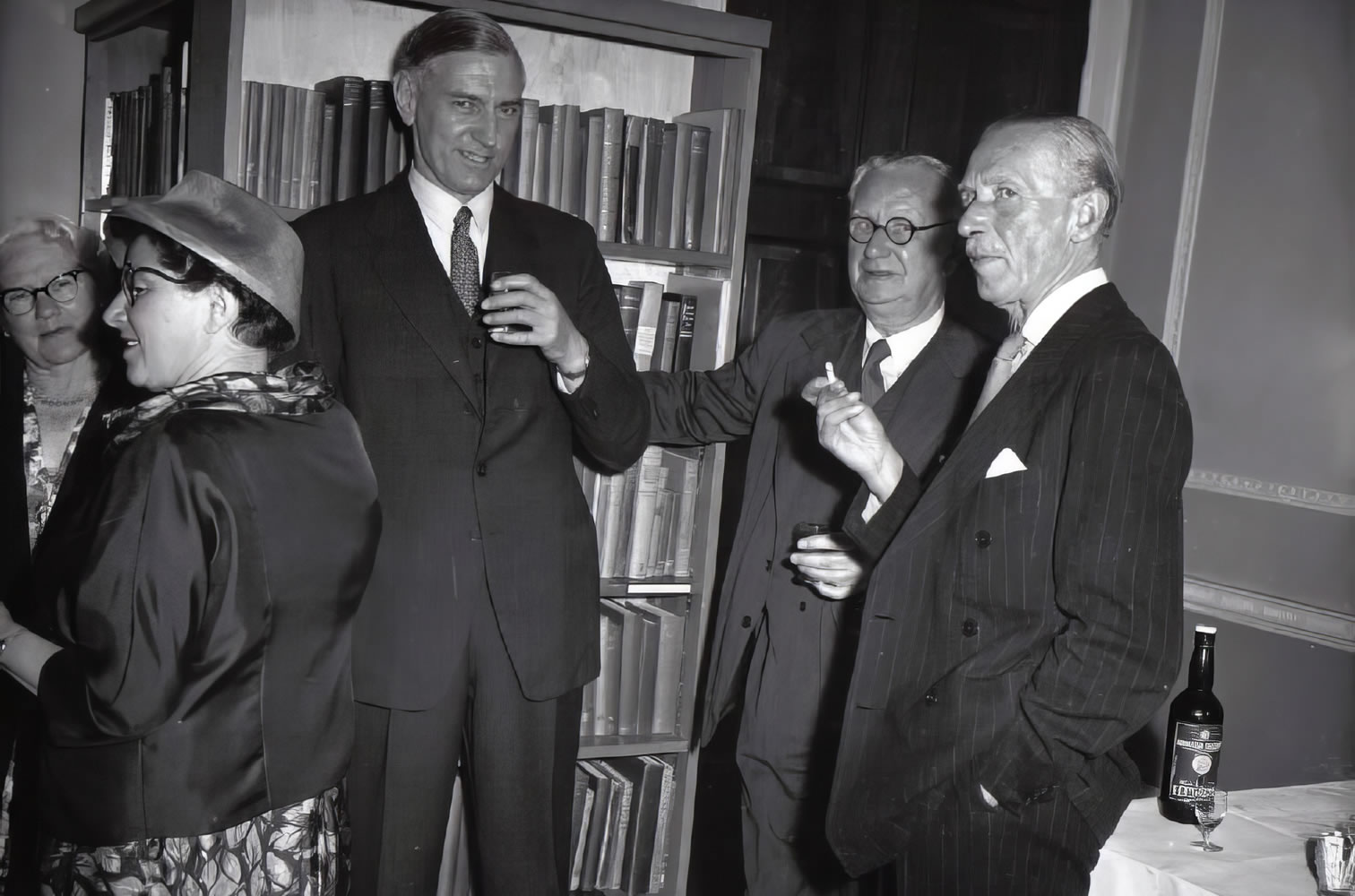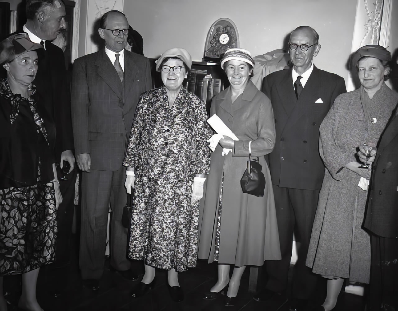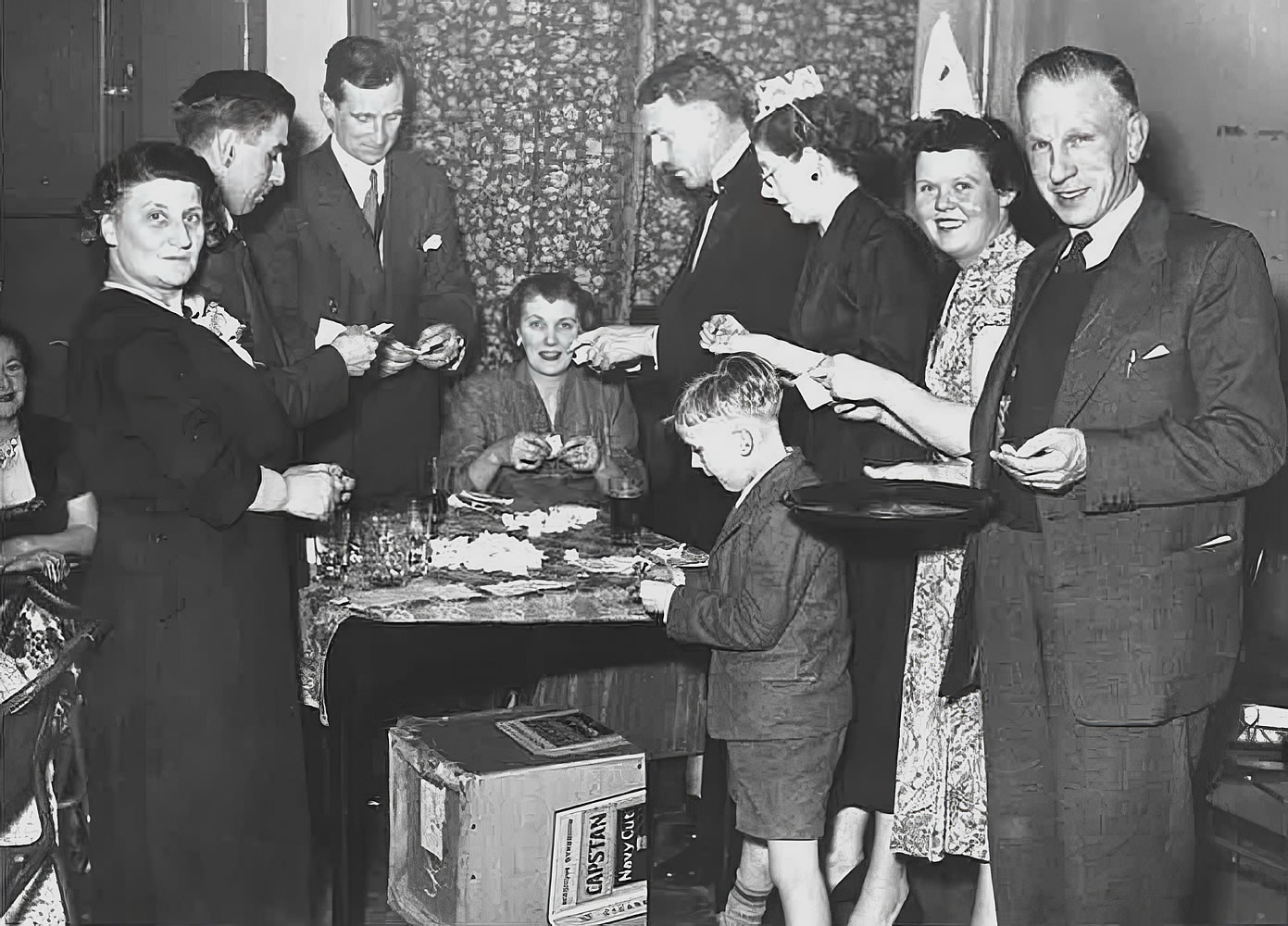 | From Speech Day, 1952: Identifiable prizewinning boys are Ian McCulloch (extreme left), Gilbert (with specs in centre), Robjohns (pointing), Brian Workman and A Jones (hand in pocket), John Scarbrow (holding cup) and Brian Jenkins (in specs and cap at right). The adults are all parents. From Brian Jenkins - June, 2005 |