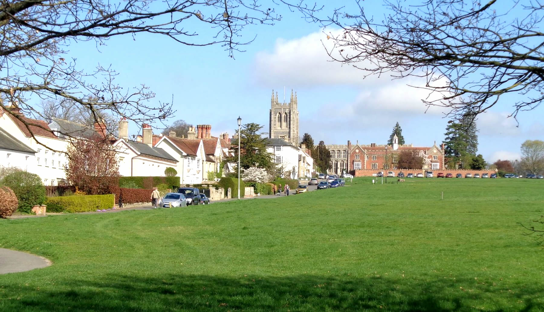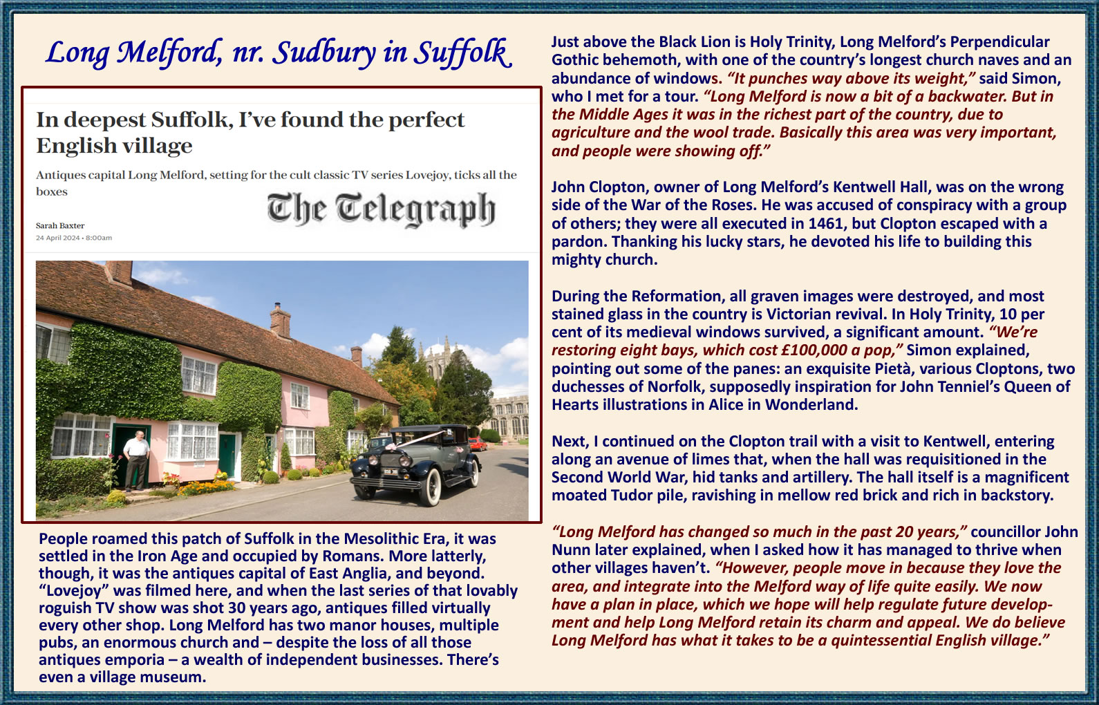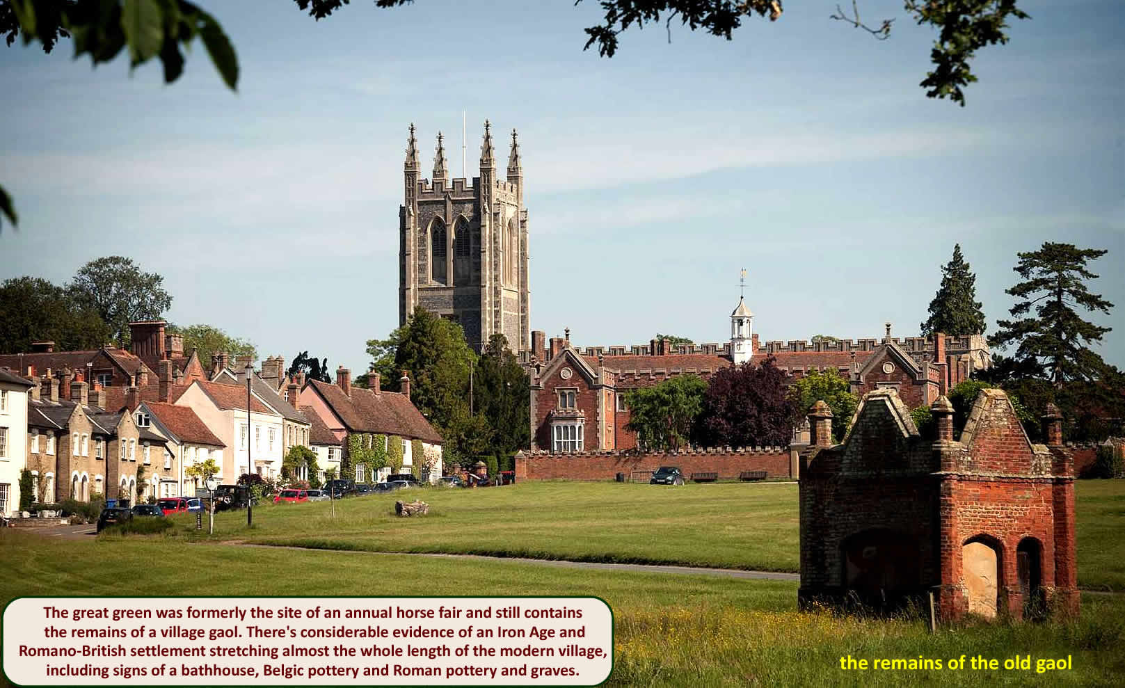 Its name is derived from the nature of the village's layout (originally concentrated along a 3-mile stretch of a single road) and the Mill ford crossing the Chad Brook (a tributary of the River Stour). History: Prehistoric finds discovered in 2011 have shown that early settlement of what is now known as Long Melford dates back to the Mesolithic period, up to 8300 BC. In addition, Iron Age finds were made in the same year, all within the largely central area of the current village. The Romans constructed two Roman roads through Long Melford, the main one running from Chelmsford to Pakenham. Roman remains were discovered in a gravel pit in 1828, a site now occupied by the village's football club. In 1997, Roman finds were uncovered including complete skeletons (with one being in a stone coffin), part of the original Roman Road, and complete samian ware pottery in a villager's garden. In June 2013, some archaeological evidence of a Saxon and Bronze Age settlement in the northern area of the village was discovered by Carenza Lewis and her team from Cambridge University during a student dig. During the Middle Ages, the village grew and gained a weekly market and an annual fair in 1235. Long Melford survived the Black Death in 1348-9, and was a brief stop-off in the Peasants' Revolt in 1381. By the early 15th century, the manor of Kentwell belonged to the Clopton family. John Clopton was arrested in 1461 and charged with treason. He was spared execution, released and returned to Kentwell. There he organised and largely helped to pay for the rebuilding of the parish church, a notable example of a wool church. During this time the wealth of the parish was increasing, with most of the inhabitants being free men, renting their homes and lands. Guilds were founded, and weaving cloth became a key part of the village's economy. In the official inspector's returns for the year 1446, there were as many as 30 named weavers in Long Melford, who between them produced 264 finished "cloths". Following the Dissolution of the Monasteries, Henry VIII granted the manor to Sir William Cordell. Modern Era: In 1604, an epidemic of the plague arrived in Melford and 119 people died between the months of May and September. During the English Civil War, a Puritan mob of over one thousand arrived in Melford pursuing Elizabeth Savage, Countess Rivers, a staunch Catholic and Royalist, from her property in St Osyth to her Suffolk estate at Melford Hall. The hall was sacked and plundered and the Countess fled to Bury St Edmunds, then to London where eventually she was imprisoned for debt and died a pauper. By the end of the 17th century, cloth production had once again become important in the area as many new entrepreneurs started to produce a range of materials known as 'Bays and Says', similar to baize and serge. These were lighter, cheaper types of cloth than the traditional woollen broadcloths that had been made in the 15th and 16th centuries but, once again, many of the cloth merchants became extremely wealthy and for some years prosperity returned to Melford. Soon after the beginning of the 19th century, a range of new industries such as horsehair weaving, an iron foundry, a flax works and coconut matting production started in Melford. By 1851, there were three horsehair manufacturers in Melford employing over 200 men, women and children. Prince Bertie, who later became King Edward VII, together with Princess Alexandra visited the village in November 1865, and large archways were constructed at key points in their honour to welcome them in, with the crowds. During the 1880s, a series of wage cuts in the coconut industry caused widespread anger and eventually resulted in strike action. Feelings ran high, culminating in a riot breaking out on polling day in December 1885, during which considerable damage was caused throughout the village. Troops were summoned from Bury St Edmunds to restore order; they arrived by train and marched from Melford station to read the Riot Act from the steps of the Police Station. In World War I, hundreds of village men volunteered to serve their country. They joined many diverse army regiments, such as the Scots Guards, Prince of Wales Regiment, Royal Engineers, the Suffolk Regiment, serving in Gallipoli, Ypres, the Somme and numerous military campaigns. Other men fought in the Royal Navy, and the newly formed Royal Flying Corps. The personal stories of these 1,100 men and how the war affected the village is found in Long Melford and the Great War – The Stories of a Thousand Lives by David Gevaux. In October 1920, the village war memorial was unveiled, and is located at the entrance of the Holy Trinity Church. During World War II, Long Melford was a location for American and Allied service personnel, who flew B24 and B17 aircraft from two large bomber stations, RAF Lavenham and RAF Sudbury, located nearby.Troops from, amongst others, the Berkshire and Black Watch Regiments, were billeted and garrisoned within the village. Injured airmen, troops from the D-Day landings and prisoners of war were treated at the large nearby 136th Station Hospital, located between Long Melford and Acton. Band leader Glenn Miller and his orchestra briefly visited Long Melford and played to injured airmen, invited locals and hospital staff at the 136th hospital in 1944. German prisoners of war were interned at a camp near the 136th Station Hospital, and Italian prisoners were located at a camp at the nearby village of Borley. USAF personnel from bases at Lakenheath, Mildenhall, and Wethersfield airbases often lived within Long Melford. By the end of the war, two B24 Liberators, one B17 Flying Fortress and one RAF de Havilland Mosquito had crashed in the parish with over twenty persons killed or injured. Numerous pillboxes and temporary gun emplacements were constructed in the village during the war, and in 2012 a previously unknown underground bunker room was located. According to the Remembrance Plaque at Hol