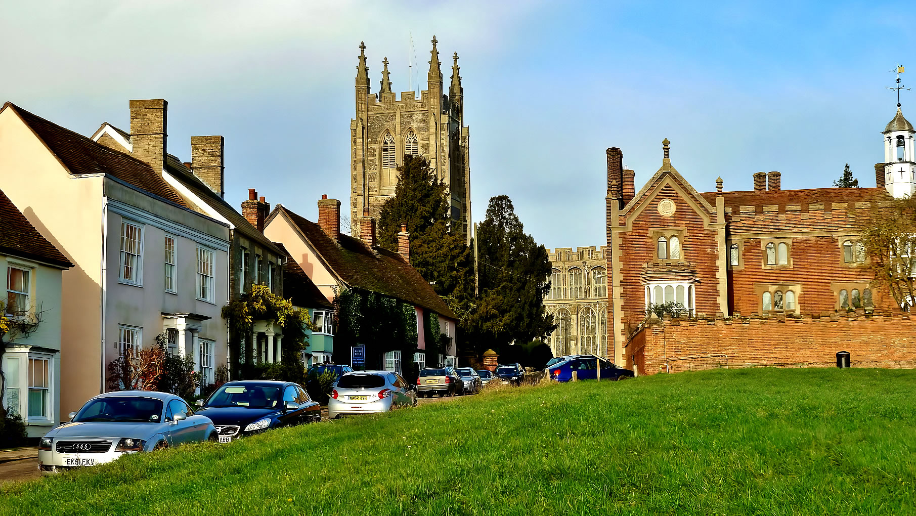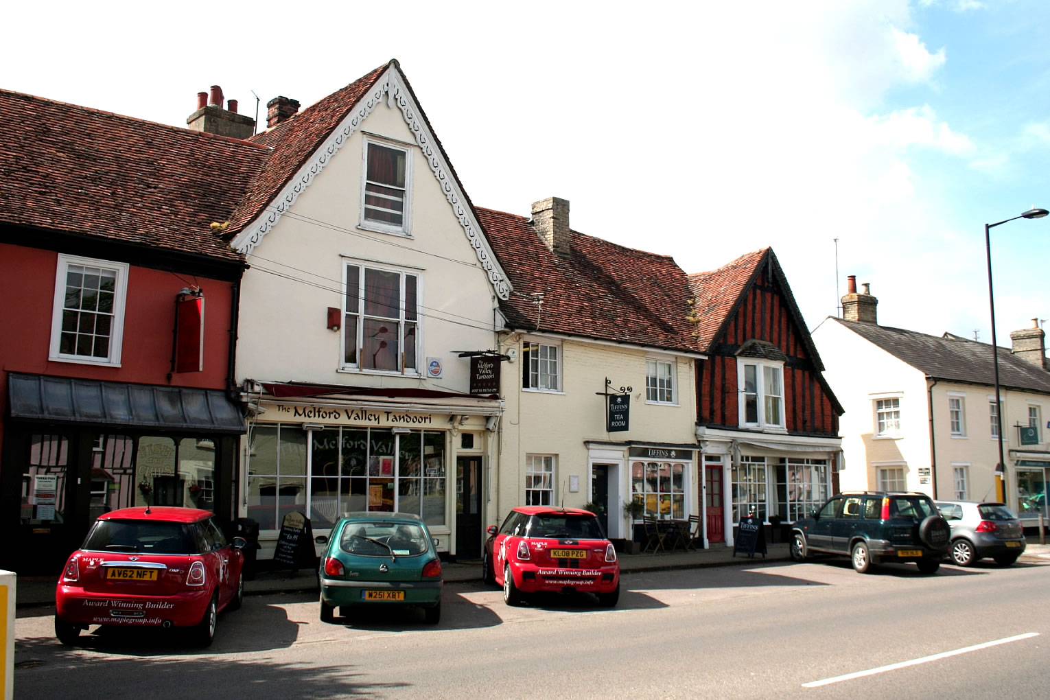| Long Melford, colloquially and historically also referred to as Melford, is a large village and civil parish in the Babergh district in the county of Suffolk, England. It is on Suffolk's border with Essex, which is marked by the River Stour, 3 miles (4.8 km) from Sudbury, approximately 16 miles from Colchester and 14 miles from Bury St Edmunds. It is one of Suffolk's "wool towns" and is a former market town. The parish also includes the hamlets of Bridge Street and Cuckoo Tye.