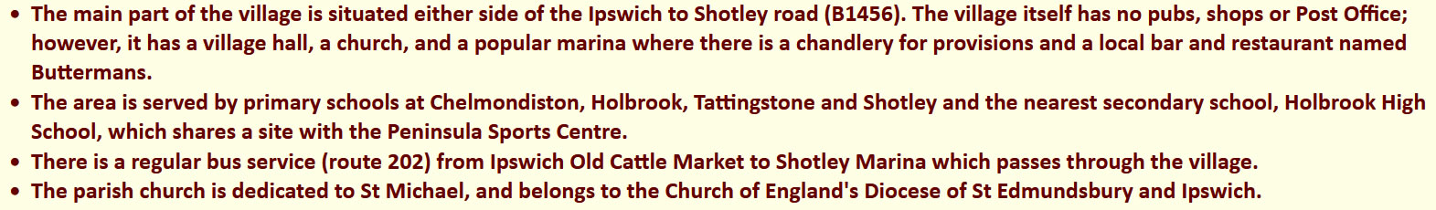 PS I was taking photos in Woolverstone and asked a gentleman passing by if there was anything to the village away from the road - to which he replied: "No, it's just a linear village of some X houses." (He told me how many but I have forgotten!).