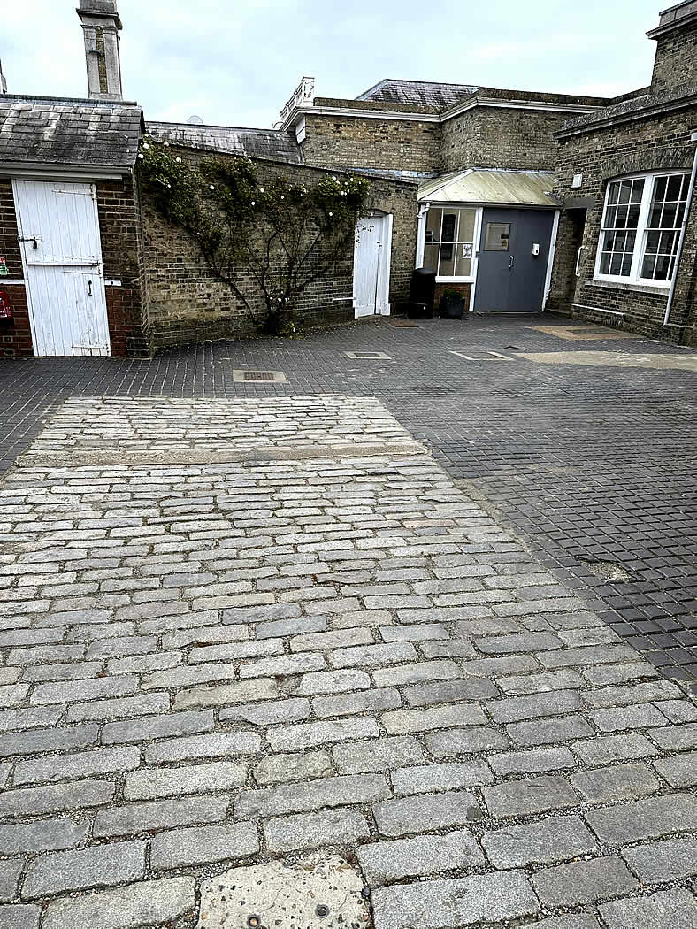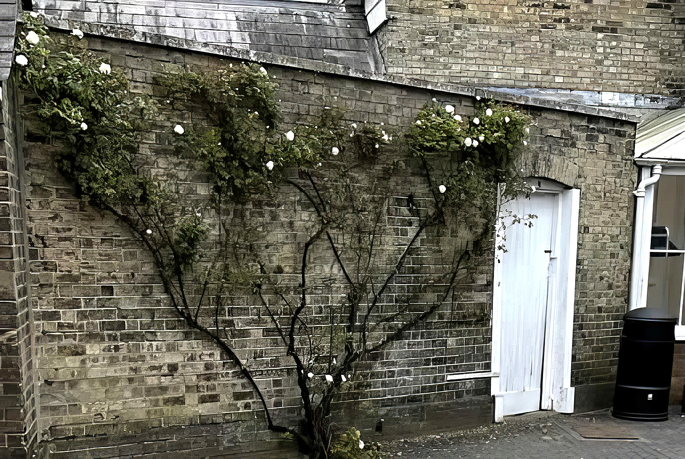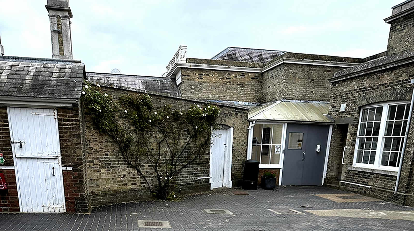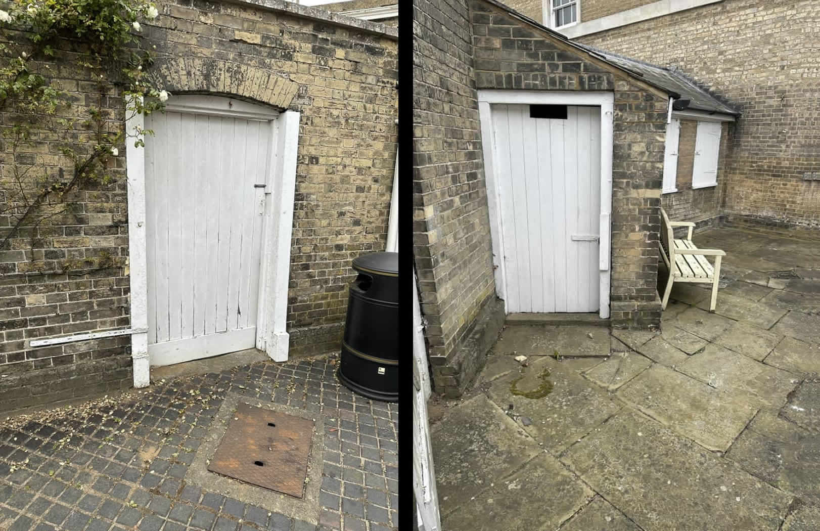 | Mark Howell: "This looks like the courtyard at the west wing of Berners. On the right was the Deputy-Head Mr Hudson's house, and on the left out of sight was Peter Sadler's house. Looking at the aerial view it seems there was another courtyard behind the white door in the middle. This wing in the 74-80 era was where there was a careers/university/polytechnic details room, an old printing-press room, Corners House lockers room? and Stretch Poole’s French room that had an anteroom used for Mrs Newman-Saunders to teach French as well - and where some Latin lessons took place.