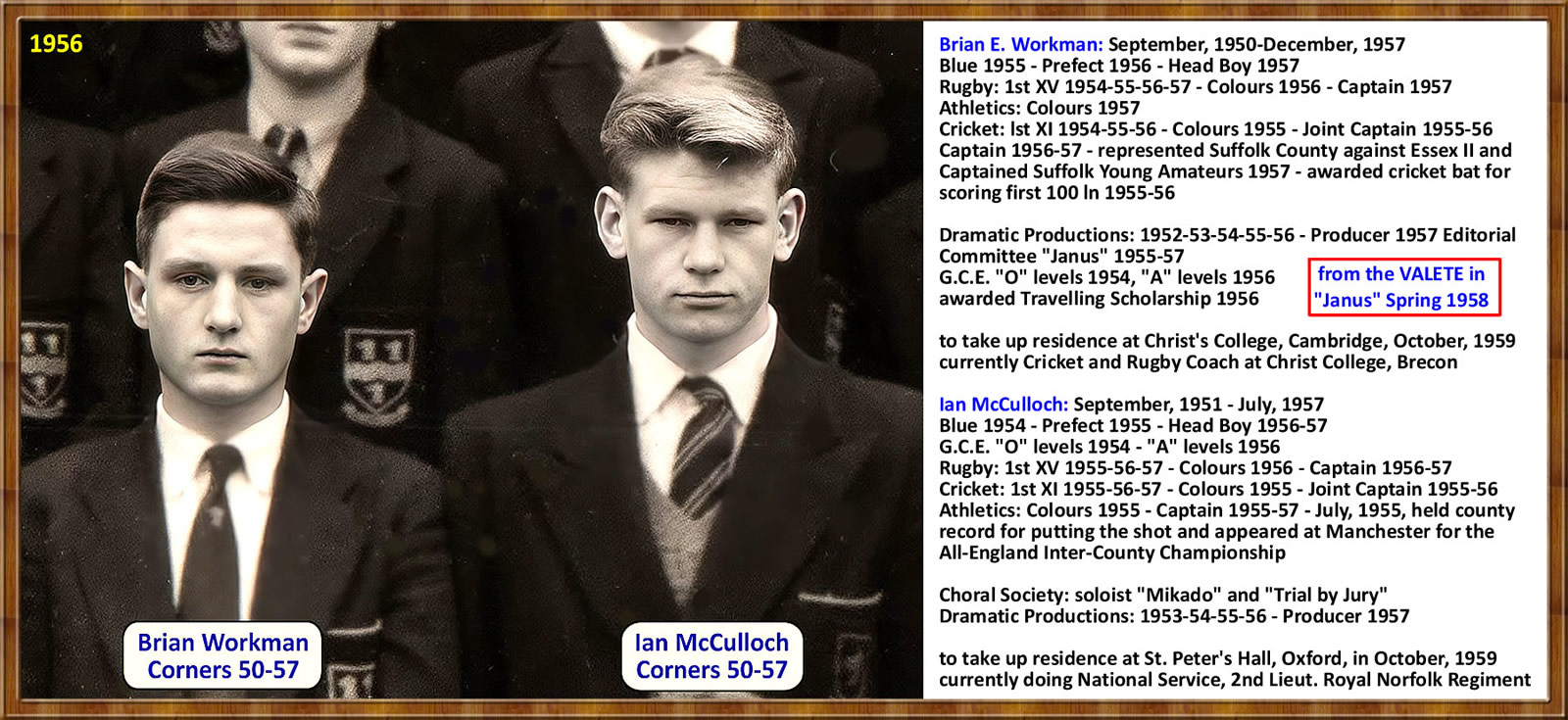 He was Head Boy sometime around 1954 or 1955 and was outstanding in all forms of sport and also academically gifted."