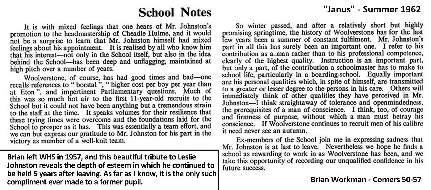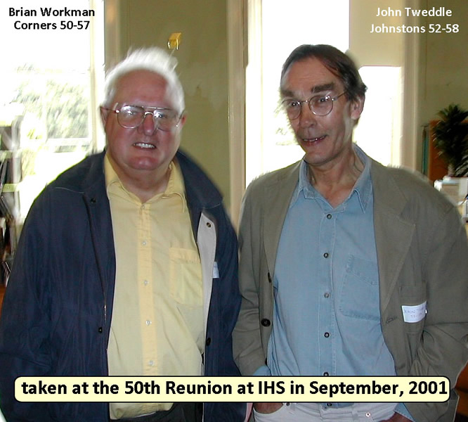 John Tuddenham - Hansons 52-57: "Brian Workman was always there, while I was at WH (52-57) He was smart, friendly, unassuming, a good cricketer, ran under 5 minutes for the mile one year ... was a nice guy. And a "no fuss" senior ... never any problems with him ... I'm really sorry to hear he has left us ... too soon."