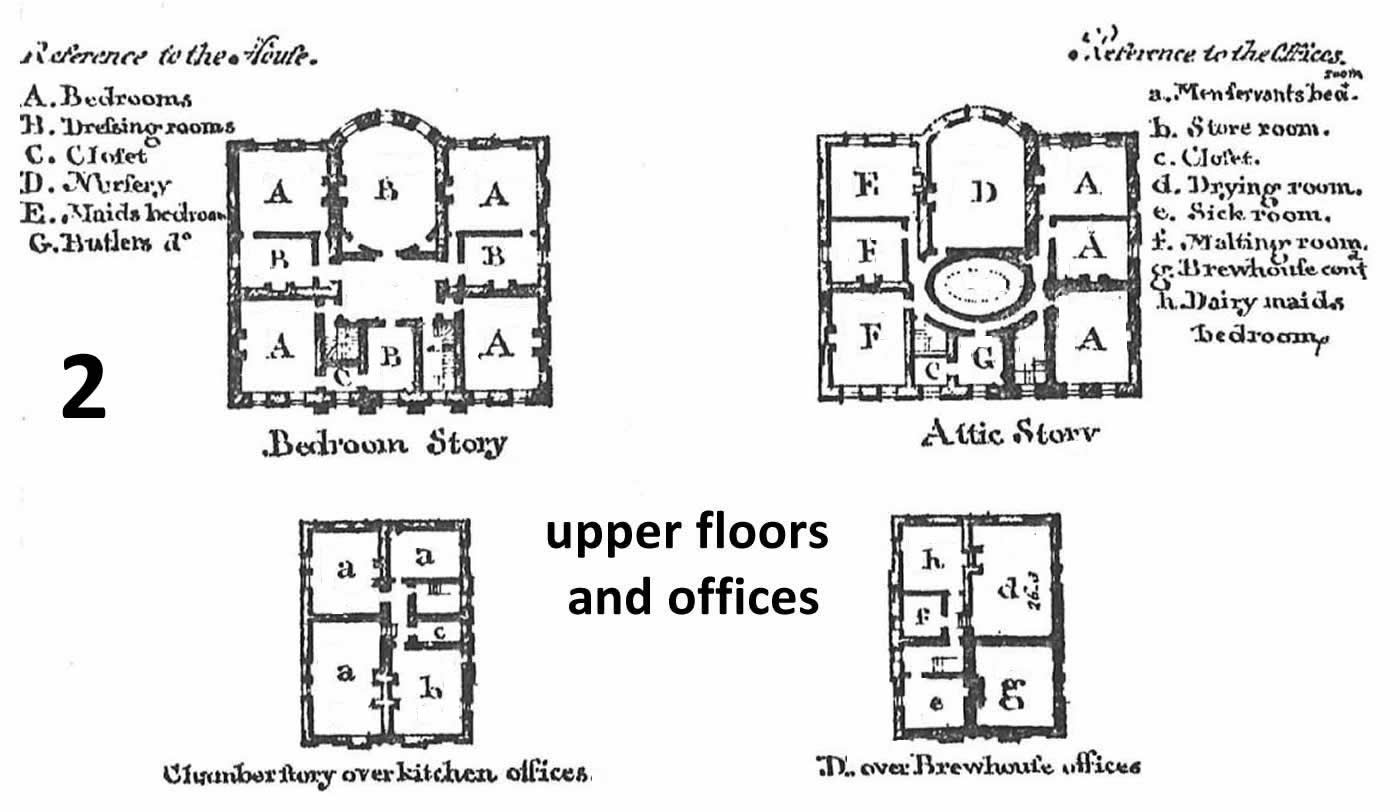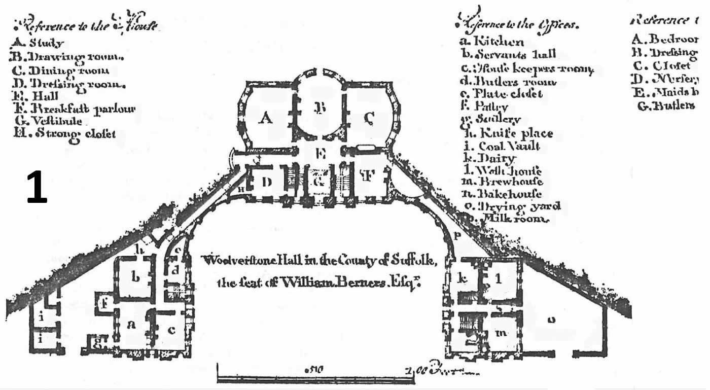 The portico of attached Ionic columns has Coade capitals: the three centre windows are surmounted by pairs of Coade sphinxes flanking an urn. All the first-floor windows on both fronts have Coade balusters. Coade is also used for the eaves modillions and for consoles under the architraves of the centre window on the garden front, and of the outer windows on the first floor of the entrance front. At East Carlton Hall, Northamptonshire, one of Johnson's best-documented houses, rebuilt in 1870, 'the Artificial Stone Ornament in the Pediment' cost £12.12. Johnson's unexecuted design for Thorpe Hall, Thorpe-le-Soken, Essex, 1782, shows urns, a frieze of paterae and Corinthian capitals; the design may have been reused on the entrance front at Hatfield Place, Hatfield Peverel, Essex, 1791-5. The text of his published designs for the Shire Hall, Chelmsford (ALSO HERE: https://www.bbc.com/news/uk-england-essex-65781433), states that 'the ornamental parts in the front are all finely executed in artificial stone'; details are given of the cornice, Ionic capitals and window consoles. Johnson's interiors frequently feature domes. The plan of Woolverstone Hall, with staircases on either side of the vestibule (G), placed the dome in the centre of the attic storey, in the position occupied by the hall (E) on the ground floor. At Woolverstone, the archways on the landing of the bedroom storey are similar to those on the staircase at Sadborow. The lower part of the Woolverstone dome has alternate oval and rectangular plaster panels; the latter with a Neo-classical urn between arabesques are similar to those in the library ceiling at Holcombe House (St. Mary's Abbey), Mill Hill. Above the panels at Woolverstone Hall is a bold acanthus frieze, of the type used by Johnson at New Cavendish Street, Langford Grove, and in the oval library at Bradwell Lodge, Bradwell-juxta-Mare, Essex, 1781-6. Between the frieze and the skylight at Woolverstone are garlands with drops, similar to those at Sadborow. The triglyph frieze with paterae below the Sadborow dome is the same type as that used on the staircase head at Woolverstone. The bold colouring of the Woolverstone dome and panels is a restoration of the original scheme. The later dome at Langford Grove was more ambitious, with garlands with drops, and bold acanthus frieze; the architrave with urns and fluting surmounted scagliola columns. Johnson's staircase at Woolverstone Hall was neither imposing, as at Langford Grove, nor attractive, as at Hatfield Place, with its oval plan, or Holcombe House, with a similar geometric stair. Its chief interest lies in Johnson's use of honeysuckle scroll balusters ; other examples of the design, executed in wrought iron with the anthemion motif cast, probably in lead, can be found in New Cavendish Street, c. 1775-7, Holcombe House, 1778, Bradwell Lodge, 1781-6, Langford Grove, 1782, and Hatfield Place, 1791-5. The accounts for East Carlton Hall, 1779-80, give details of ironwork, including 26 'Scroll Honeysuckle Pannels for Staircase' and 5 curved panels, but Johnson's source of supply is not indicated. The treatment of the vestibule (G) and hall (E) at Woolverstone Hall was paralleled at Langford Grove, where the coved hall had similar circular medallions. The colour scheme in this part of Woolverstone is a restoration of the original. At Bradwell Lodge, both the entrance and staircase halls, linking the Tudor and Georgian parts of the house, are coved ; the entrance hall has small circular medallions, similar to those at Woolverstone Hall and Langford Grove. The staircase hall at Bradwell Lodge is domed and has larger oval medallions similar to those in the hall (E) at Woolverstone. Niches flanking the door to the drawing room (B) at Woolverstone originally contained statues, a feature not known to occur elsewhere in Johnson's domestic work. It is less easy to comment on other characteristics of Johnson's interiors at Woolverstone. The fireplace in the drawing room (B) is white marble with Siena inlay and can definitely be considered Johnson's work; similar later examples exist at Bradwell Lodge and Hatfield Place. Johnson also used Siena inlay at Killerton and for the fireplace at East Carlton Hall, which cost £56. The white marble fireplaces in the dining room (C) and the study (A) at Woolverstone maybe contemporary or could possibly be associated with Hopper's alterations; it has been suggested that they could be the work of J. C. F. Rossi (1762-1839). The painted 'Pompeian' fireplace in the dressing-room (B) on the first floor echoes the bow and arrow and quiver and torch motifs of the ceiling, which has been restored in the original colours. Johnson also used these motifs in the library ceiling at Holcombe House and in the drawing-room ceiling at Langford Grove. The ceilings in the drawing room (B) and dining-room (C) on the ground floor at Woolverstone were also designed by Johnson, although the use of gold in the latter is not original; in the dining-room the panels in the form of radiating petals round the central motif, possibly based on a soffit in the Temple of the Sun at Palmyra, are almost identical in treatment with those in the ceiling of the front room on the first floor at 63 New Cavendish Street. The ceiling in the study (A) at Woolverstone may be associated with Hopper's alterations, but could well be as late as c. 1860. The treatment of the niche in the dining-room (C) is reminiscent of that at 63 New Cavendish Street. The present blue and white treatment of the walls in the dining-room (C) represents an old, but not necessarily original, colour scheme. The Woolverstone estate remained in the Berners family until it was sold by Geoffrey Hugh Berners in 1937 to Oxford University. The London County Council leased the mansion with 53 acres of grounds in 1946 and established the residential section of the London Nautical School there in September 1947. The school was reorganised as a secondary boarding-school 