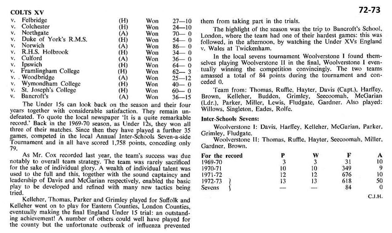 Mike O'Driscoll: Well done! Year above me. I recognised about half the faces but could only get a few names. Given the ball, the uniform and the numbers I'm guessing it's the Colts team. I believe they were one of those years who went right through their career without losing a match. We let them down as the following cohort with early season losses to Colchester RGS and Wymondham - both of whom started their season a couple of weeks before us and were more match fit. Both defeats were avenged by the end of the season!