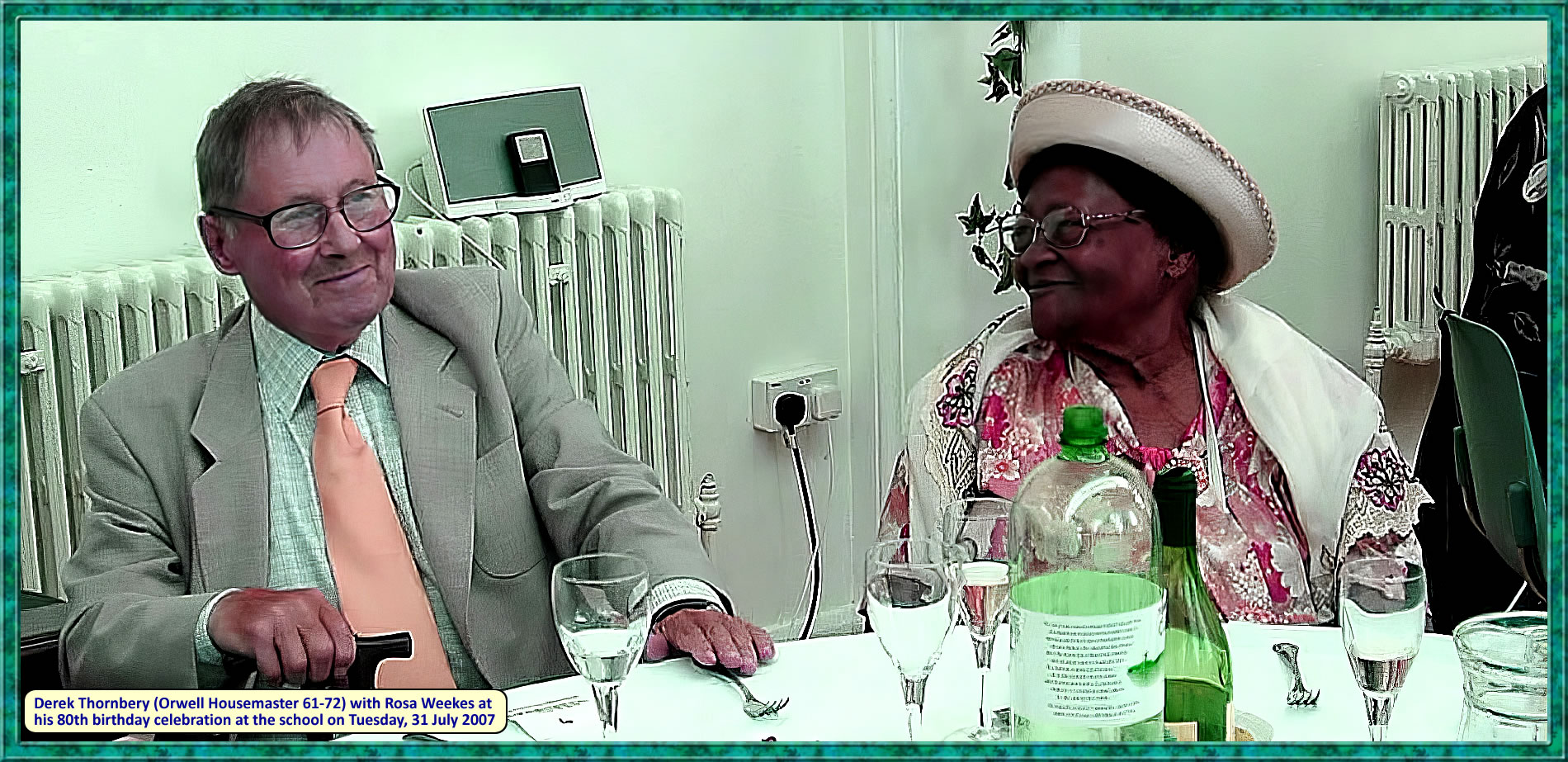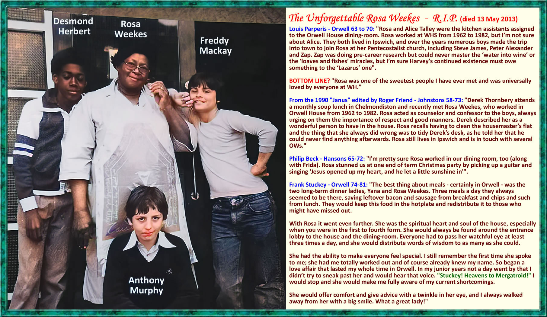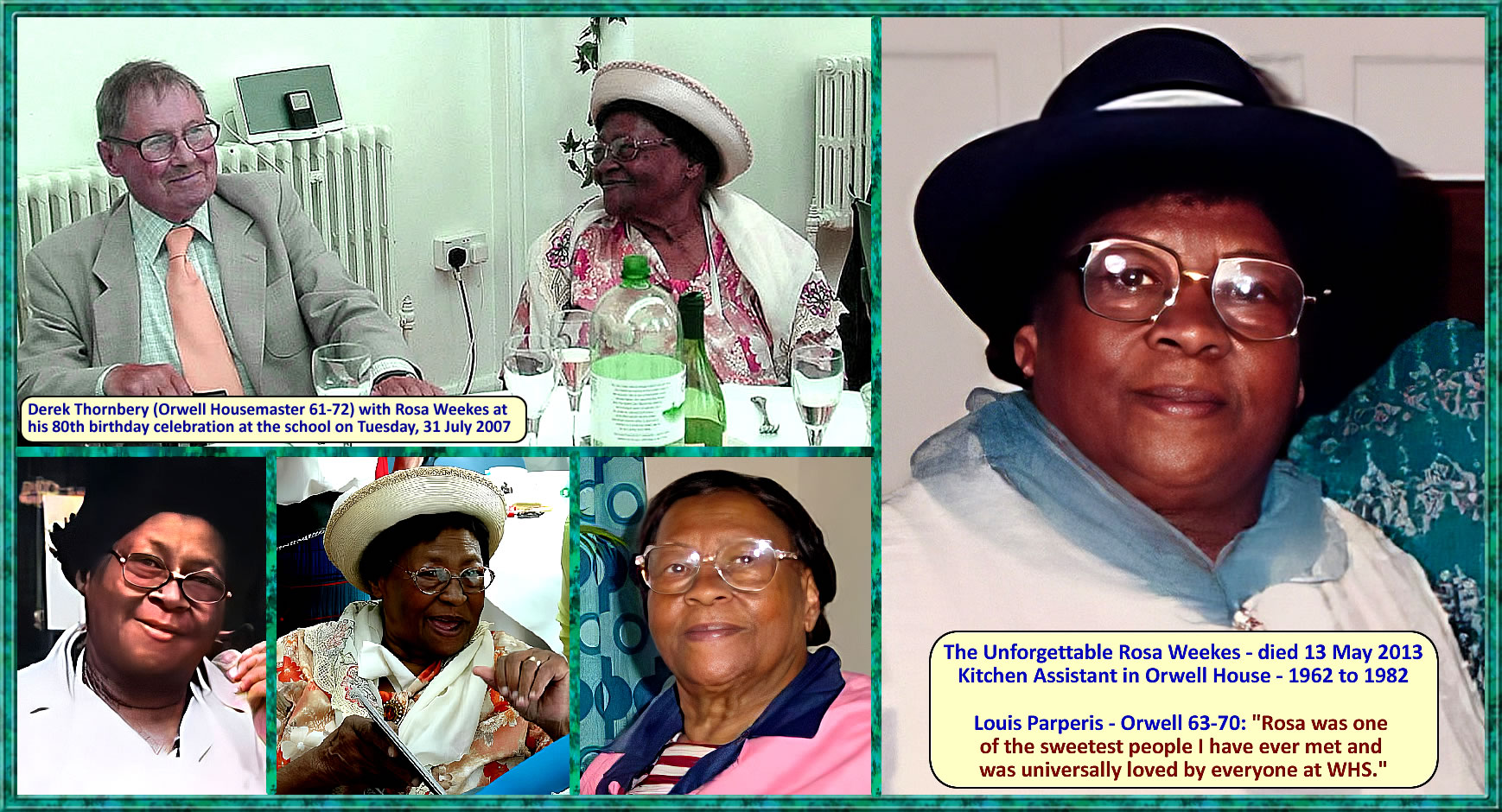 From the 1990 "Janus" edited by Roger friend - Johnstons 58 to 73: "Derek Thornbery attends a monthly soup lunch in Chelmondiston and recently met Rosa Weekes, who worked in Orwell House from 1962 to 1982. Rosa acted as counselor and confessor to the boys, always urging on them the importance of respect and good manners. Derek described her as a wonderful person to have in the house. Rosa recalls having to clean the housemaster’s flat and the thing that she always did wrong was to tidy Derek’s desk, as he told her that he could never find anything afterwards. Rosa still lives in Ipswich and is in touch with several OWs." Philip Beck: "I was in Hansons '65 - '72 and I'm pretty sure Rosa worked in out dining room too (along with Frida). Rosa stunned us at one end of term Christmas party by picking up a guitar and singing 'Jesus opened up my heart, and he let a little sunshine in'". Frank Stuckey - Orwell 74 to 81: "The best thing about meals - certainly in Orwell - was the two long-term dinner ladies, Yana and Rosa Weekes. Three meals a day they always seemed to be there, saving leftover bacon and sausage from breakfast and chips and such from lunch. They would keep this food in the hotplate and redistribute it to those who might have missed out. With Rosa it went even further. She was the spiritual heart and soul of the house, especially when you were in the first to fourth form. She would always be found around the entrance lobby to the house and the dining-room. Everyone had to pass her watchful eye at least three times a day, and she would distribute words of wisdom to as many as she could. She had the ability to make everyone feel special. I still remember the first time she spoke to me; she had me totally worked out and of course already knew my name. So began a love affair that lasted my whole time in Orwell. In my junior years not a day went by that I didn’t try to sneak past her and would hear that voice.”Stuckey! Heavens to Mergatroid!” I would stop and she would make me fully aware of my current shortcomings . What a great lady!" David Jones - Orwell 72-80: Just a wonderful human being. She would chastise me and comfort me. Listen to me and lecture me. Advise me and admonish me. I still remember her with incredible fondness. Frances Vincent: I always remember her telling me that before she arrived in England she thought the streets were paid with gold. Lovely lady. Bill Kitchen: We in Hanson’s knew Rosa very well. Always kind and keen to share a laugh. She even invited me to attend her church in Ipswich when in discussion I’d mentioned how boring our school assemblies and Sunday services were. Peter Alexander - Corners 64-71: How could I ever forget. She was full of kindness - and there was a lot of Rosa! She called me Carl, possibly because she didn’t to add the ‘ile’ to make the complete surname. Carl in that wonderful West Indian accent. How could I forget the worship: so uplifting and spiritual. |