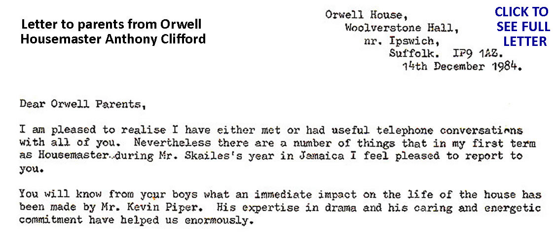 Dean Haney - Orwell 82-87: "Wow… I remember this period very clearly, with Mr Skailes away for a year it was a very passive time for Orwell House. Both Mr Robinson and Kevin Piper were incredibly nice and sincere teachers/houseparents. Alexander Bingham, didn’t you have a hand in the Orwell Christmas Drama group? I seem to remember the graffiti wall was very groundbreaking, bordering on reckless, but seemed to excite everybody."
