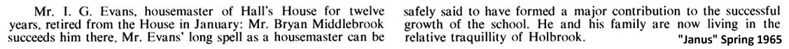 | Ivor Glyn 'Taffy' Evans : Maths, P.E. & Rugby 50-70 - Asst. Hm. Hansons 50-53 - Hm. Halls 53-65 |