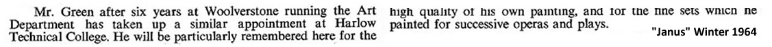 Chris Snuggs: "One of the many special things about WHS was the focus - conscious and/or unconscious - on teamwork. Each team has its stars, but Ernie was probably not the first to come to mind. Gently, kind, unassuming, quiet (I never heard him raise his voice) he did his best to teach non-artists how to draw and paint. He didn't turn us all into artists, but I remember his classes being agreeable, peaceful, interesting and a welcome change from everything else going on. But in one area he definitely was a star. We all remember the dramatic and musical productions, though probably think first of the actors and musicians, but during his time at WHS Ernie did a huge amount to make the sets for all productions nigh-on professional. I never heard or would imagine anyone saying after a production: "I didn't think much of the sets."