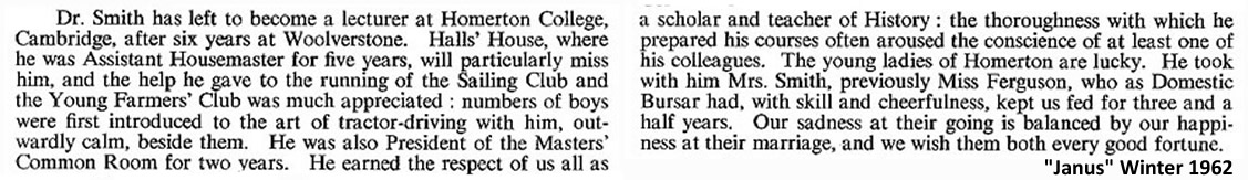 Louis Parperis: "Alfred Hassell-Smith, who died in 2013, was an eminent historian specialising in the social history of the 16th century, particularly in Norfolk where he was born and spent much of his life. He became a professor in the history department at UAE which is where I came into contact with him, without realising he had once taught at Woolverstone. He was married, but not to the delightful yet redoubtable Joan Kynaston-Shaw, a lifelong spinster and a very accomplished makeup artist whose skills contributed enormously to school productions." |