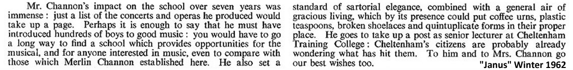 For us lower school kids he was pretty heroic - not in the same way as Bill Coutts or Mickey Baranyai of course, but in an equally devoted sort of way. And yet I seem to remember him being a good communicator even with unimportant little oiks in year 1, interested in our musical progress, always encouraging - even though he was always very busy! Never heard him play the cornet enough, but when we did it was exciting. Musical experiences at Wolverstone remain unforgettable for me - more than that, sublime, exciting, participative, creative, magical. He was not called Merlin for nothing. We thought he was irreplaceable when he left, but then along came Barry Salmon!!" Chris Fuller: "Practical as well as creative, Merlin was the one who brought girls to Woolverstone so that we wouldn't have to dress up as girls in all his productions. For most of us, that was a double blessing!" |