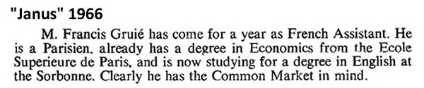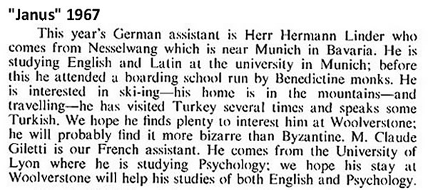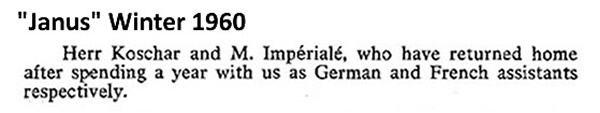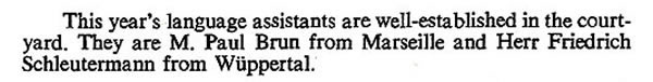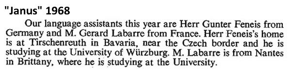 The Language Assistants: young men with energy, talent and ambition who gave a huge amount to the school. Unfortunately, some are either hardly mentioned in "Janus" or not mentioned at all - but I am sure they are remembered by (some of!) the boys!