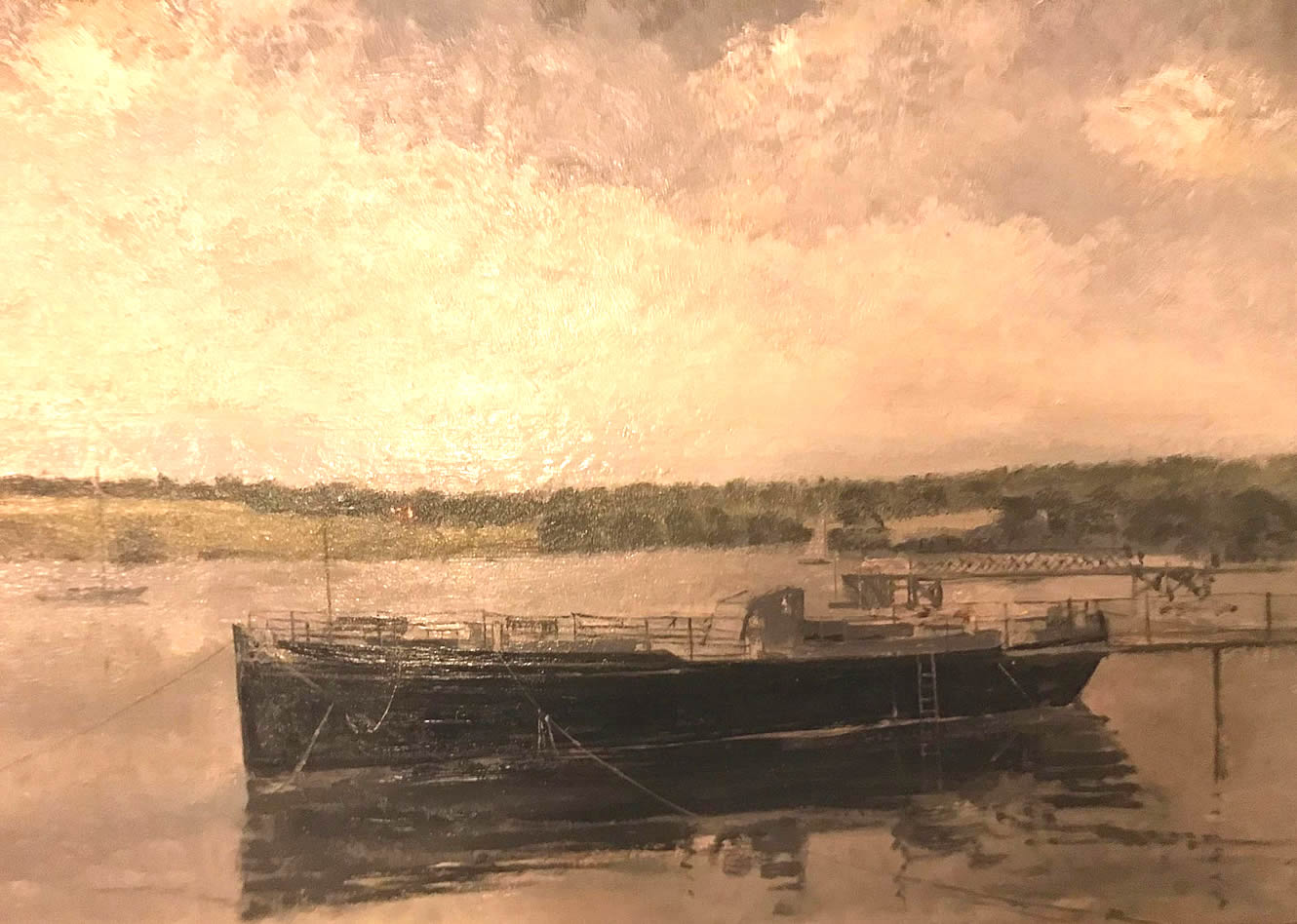 When Ann and Merlin moved to Suffolk in 1955 they first lived on a barge which was moored just below Woolverstone Hall. Merlin didn’t have far to walk to school but at high tide had to walk the gang plank. This was a picture of the barge that he painted.