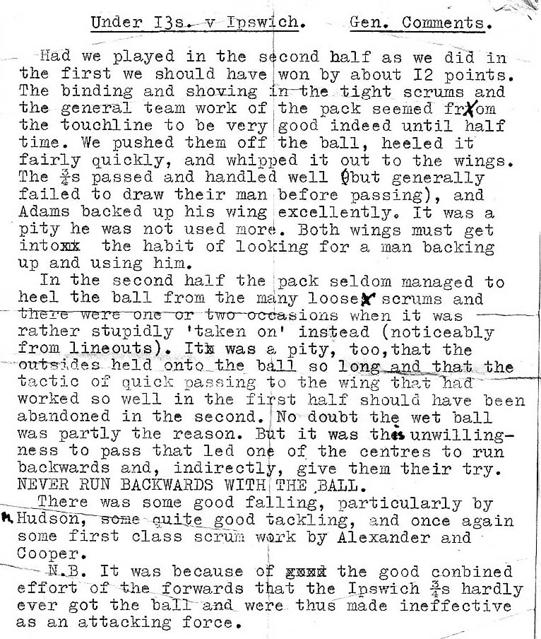 A good game in which nearly everyone played very well. The comments which the Holbrook masters made on the touchline and after the game (both today and last Saturday) would have made you blush with pride. As far as I could see from the edge of the field, the best performances were by Alexander, whose dribbling, taking advantage of an opponent’s mistake, general following up of the loose ball, and defence work were all first class; Whittaker, who was the first person to outhook the Holbrook hooker in seven (or was it nine?) matches to get the ball so often when our scrum was losing the shove in nearly every scrum was no small achievement; King, who covered in defence, followed up, and joined in the movements well; Waughman, Suffling and Miles, all of whom cut through, passed and backed up splendidly. Waughman was inclined (as often in the past) to hold onto the ball too long and thus either get tackled by the forwards or give his centres no chance of developing a movement. In the second half he was much better in this respect and the try we scored was as good as any this term. Hudson also played one of his better games at full back. He positioned himself well and fielded the ball cleanly and calmly. O’Leary gave a good service to Waughman, allowing the latter to run into the pass, and also caught some difficult passes from the lineout. Dibbin marked his scrum half well and was unlucky to be given offside on some occasions. His decision sometimes to take a lineout instead of a scrum was a sound one I think as at one point it was important that the forwards be rested at the risk of not getting the ball. Once the scrum is exhausted one has lost the game. The weaknesses or faults which cost us victory were 1) our slowness in getting the ball out of the scrum once it had been hooked (very difficult to do when being shoved backwards and 2) the failure of the wings to back up Miles and Suffling. This was not surprising as Adams has not played on the wing before - and he was thus often out of position - and this was also Nash’s first match. But the result was that a centre was often left out in front on his own searching for someone to give the ball to. There being noone about he was finally tackled with the ball and more than once held onto it in the hope that someone would arrive in support. This is natural, but illegal. There was one penalty which we had at the end of the game when we were in their half, which Suffling kicked into touch when the short kick would have been better. To have given our outsides the ball would have been much more frightening to Holbrook than to have given them a throw-in. Cooper B., Webb and Burr were useful in the lineout as usual and Croft did at least one of his speciality interceptions. This has in a way been a frustrating season: so often we have had the greater part of the play without being able to force a win, and so seldom have we had our full team. But the standard of rugger has been high and the spirit in which it has been played - not only in the team but in the whole of the A group - has been admirable. Well done and thank you. |