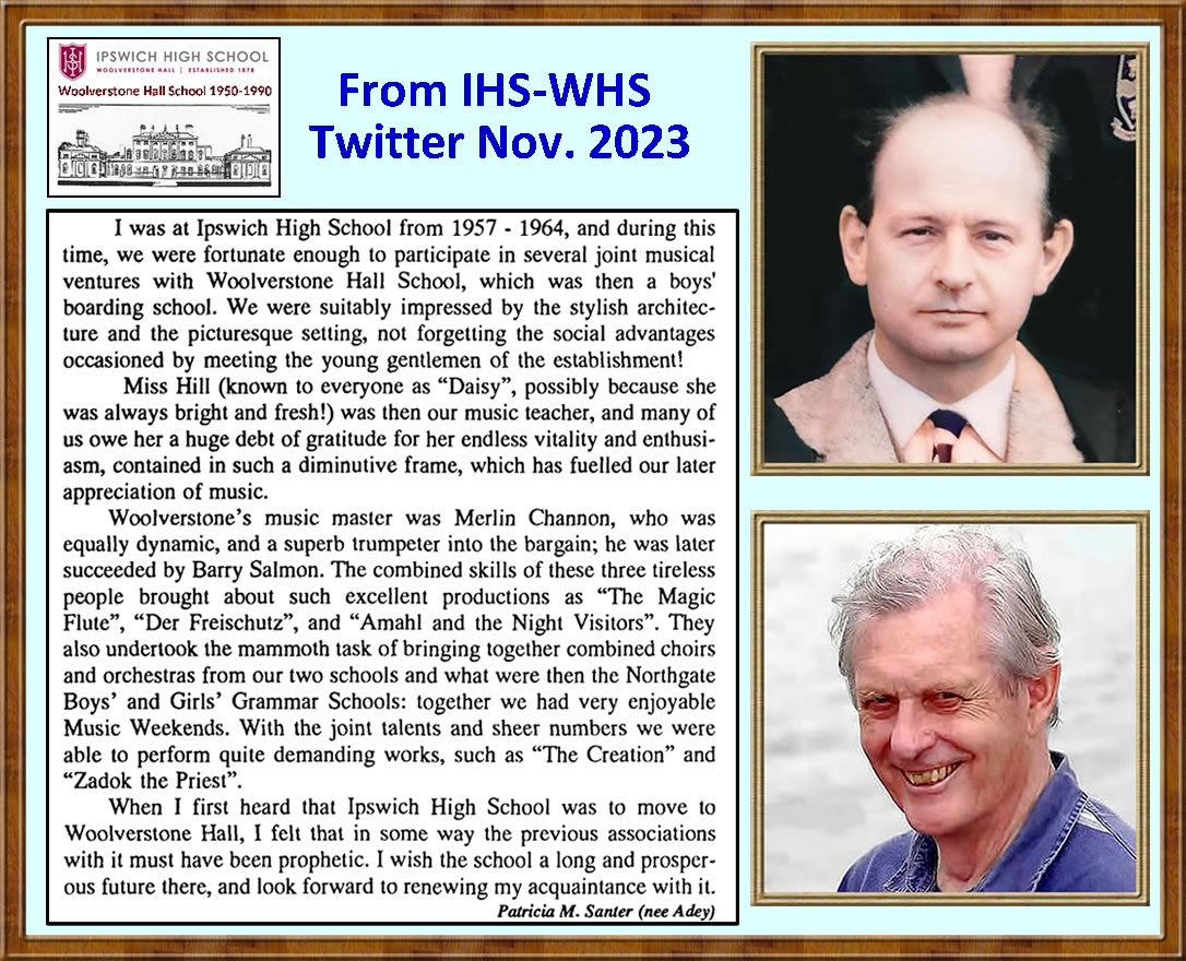 Musical experiences at Wolverstone remain unforgettable for me - more than that, sublime, exciting, participative, creative, magical. He was not called Merlin for nothing. It seemed to me to be a disaster when he left, but then came his phenomenal successor Barry Salmon! What luck we had!" (Chris Snuggs - November 2021)