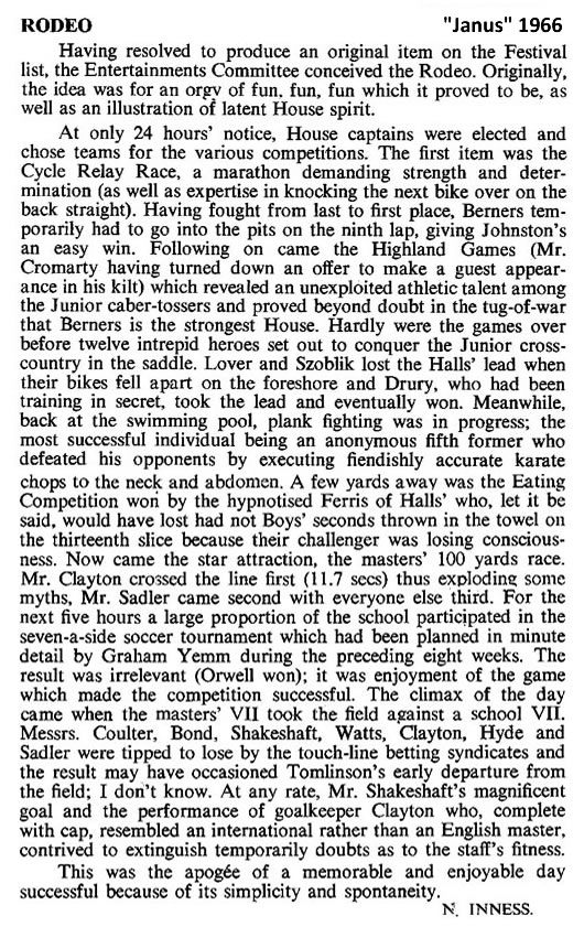 - The RODEO was apparently a roaring success, at least from the "Janus" accounts. I was not there, but others who were can judge, so WHY did it apparently die in 1970, after which I can find no reference to it, nor indeed reports of Staff v Boys football matches.