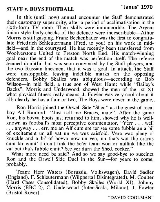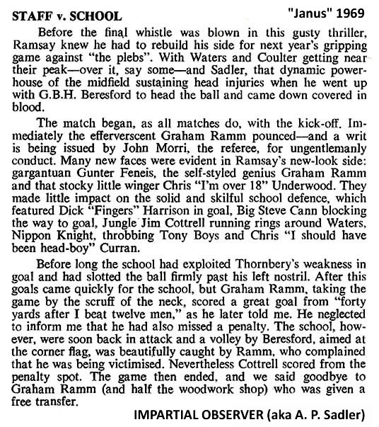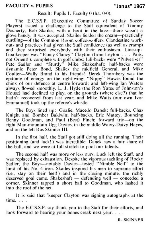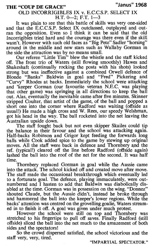 PS When I arrived in 1958, soccer was not mentioned officially, it being rumoured to be hated by Taffy and even the word never to be mentioned in public. "Football" indeed, meant ONLY rugby ....... Our soccer experience was limited to unofficial kickabouts on Orwell Side on Sundays, a time and place where Taffy was never to be seen ..... So having an official Staff v Boys match in 1966 shows how far sporting emancipation had come!