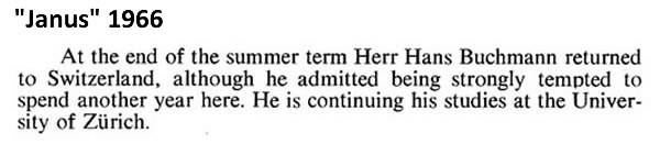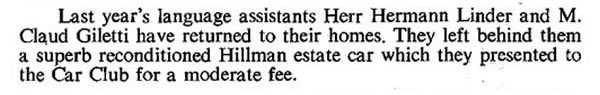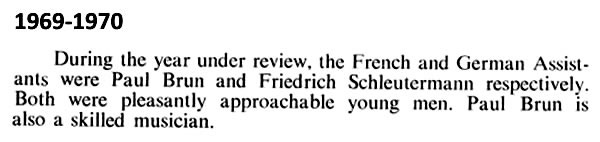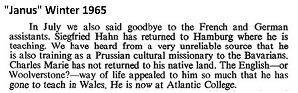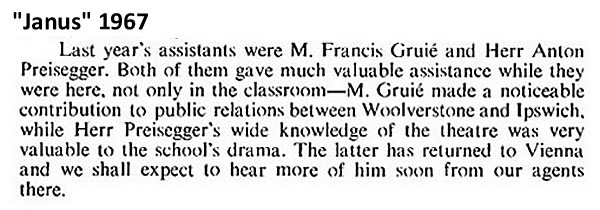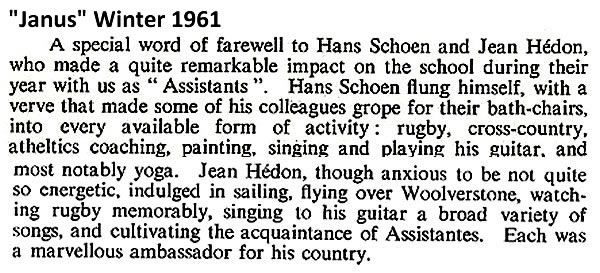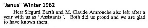 John Tuddenham (Hansons 52 to 57): Did you come across someone called Becherelle? French teacher - spelling may be wrong. Chris Snuggs: Subject to my error, I can't find ANY details in "Janus" of who worked in the school before 1959 - apart from the major players. "Staff Notes" began in 1960, and were pretty detailed, except that the FIRSTNAME of staff was seldom given. I always wondered why ... spelling looks right, but not seen the name anywhere .... Chris Snuggs (Berners/Halls 58 to 64): No mention of that in "Janus"! I don't suppose JSHS was amused (or would have been amused if he had found out about it!) John Tuddenham: I think he fired him .... |