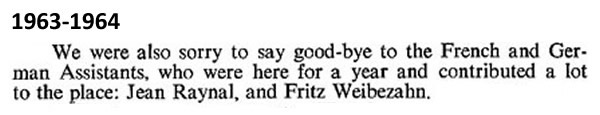 Fritz Weiberzahn was our German Assistant in 1963/1964, and the "Janus" report doesn't really do him justice. Lessons with him, I don't remember, but not long after he arrived he formed a jazz-band with a group of 1st year 6th formers. Most of us were not real musicians, but Fritz was a proper pianist, and told us what to play and when. We mostly rehearsed in the hall and performed on several occasions of different kinds. I forget how and why, but we named ourselves "The Feetwarmers". I was never too happy with this rather soppy title: I would have preferred "The Glenn Miller Rejects", but Feetwarmers it was. I think we weren't too bad, but lacked showmanship; one of us should have made witty speeches introducing us and announcing what we were going to play. As far as I remember, we just came on, played and went off! It was a great exerience, and one I have never come remotely close to repeating since I left WHS. They were a wonderful bunch of guys to play with, and Fritz a really great mentor. David Odell was on drums, and often a bit loud. We never managed to get him to bash away a bit more quietly! When I met his widow on one of the barge cruises in the early 2000s I was very sad to hear that he had died quite young of cancer. He was a lovely guy, but life can be cruel as we know. We never heard from Fritz after school days, and I often wondered how he got on in later life. If ever you read this, Fritz, you'll know how much we appreciated you and loved the fantastic experience you gave us.