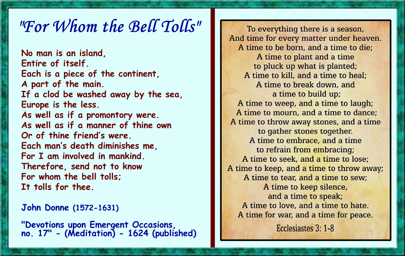 I only saw him twice after leaving school: one in 1966 when I went to visit him and Cedric Delves at a school in Bungay where they were doing work experience and then again sometime in the early 2000s at one of the Victoria Pub reunions. Other than that we had no contact and I cannot therefore say that we were in any way close, but his passing has saddened me more than I would have expected - and indeed diminished me in the Donnian sense as explained in his poem, which I believe to be the most beautiful and sublime ever published. Our generation can now expect to lose on a regular basis those we went to school with - but that in no way makes it any easier.