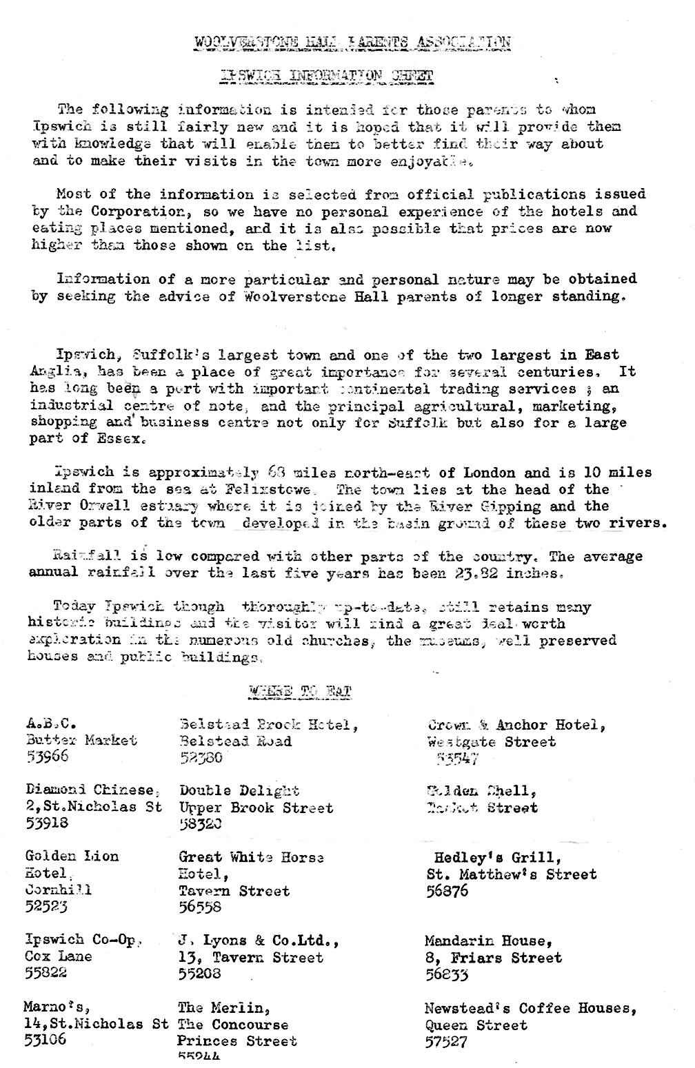 I think the Parents did a lot for the school in practical terms. Others may provide more details, but I seem to remember them buying a yacht at some point and they also helped finance the swimming-pool - now sadly filled in. I don't have a particularly vivid memory of my parents visiting WHS (except once when they took me and my then girlfriend to Felixtowe in the afternoon - how could one forget that!), or indeed of Parents and Open Days. Were they combined? I can't remember, Actually, what was the relationship between Speech Days, Open Days and Parents' Days? Were they ALL combined? The practical arrangements may of course have varied considerably over the years.