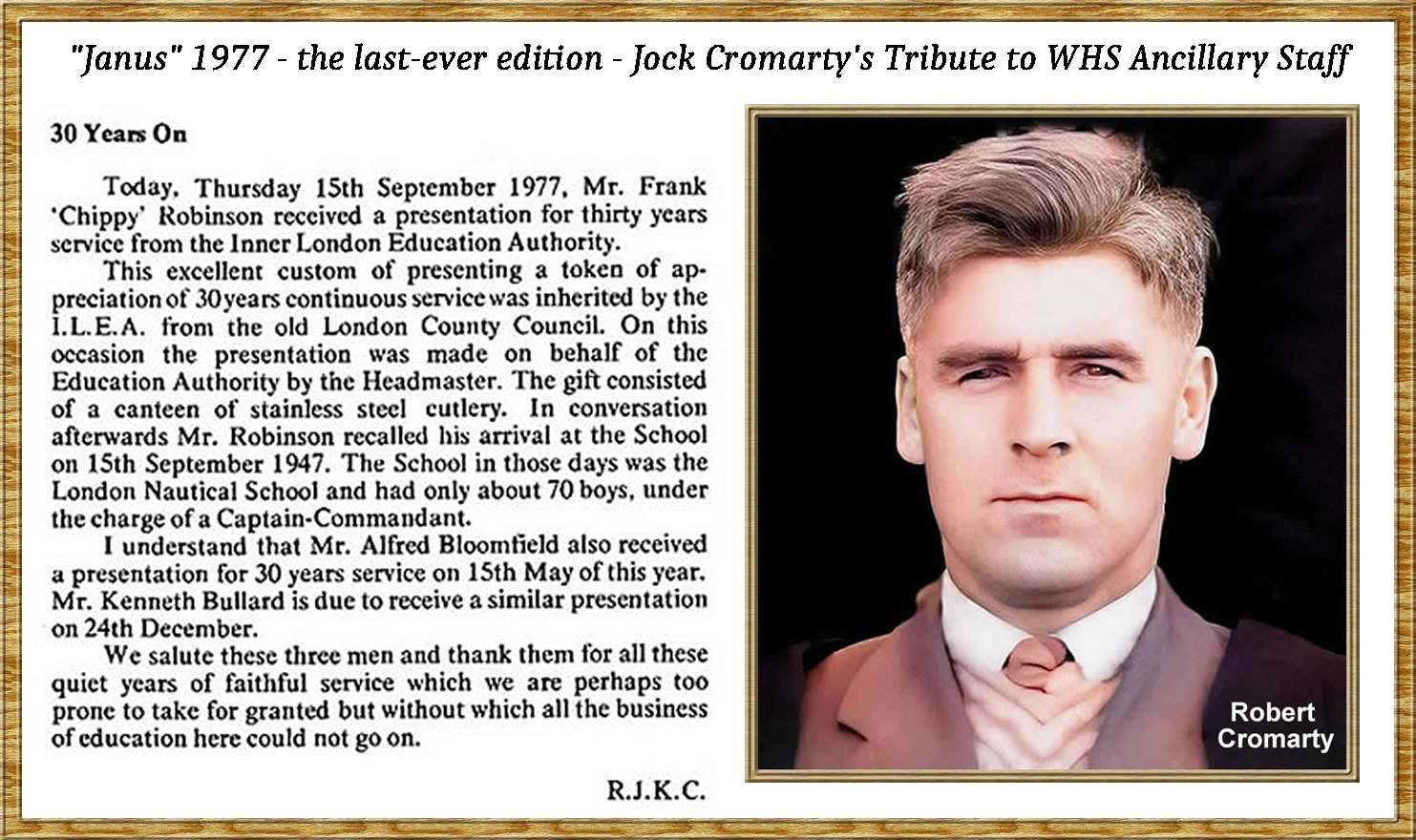 I have just completed profiles for all WHS Non-Teaching Staff mentioned in "Janus" plus others gleaned from various sources after "Janus" ceased publication in 1977. This exercise renewed my long-standing admiration for the symbiosis between school and NTS. As Jock Cromarty so nobly said in his post in the last "Janus" in 1977, we could not have done it without them. The cooperation between the local community and the school was quite moving - and useful! We were a valuable source of income for four decades: a wonderful thing after the apparent initial local fears about a bunch of borstal kids being sent up to Woolverstone! It didn't take long to set them straight on that!