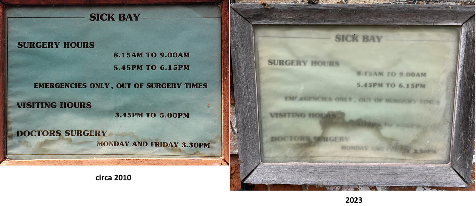 The Sick Bay has lain unused since WHS closed in 1990, reportedly because of the asbestos therein making renovation dangerous and expensive, but we do not have precise details about that at this time. One interesting question is WHEN was the building first used as a Sick Bay? Jonathan the IHS Caretaker has been renovating the old SB sign, and informs us that UNDER that sign is a red CROSS and the words "Sick Bay". I have always assumed it was a Sick Bay from beginning of WHS in 1950, but did the LNS, the military and even the Berners family use it for that purpose before? The Berners had plenty of staff on the estate who would have fallen ill from time to time; perhaps they were treated onsite? Further investigations will follow!