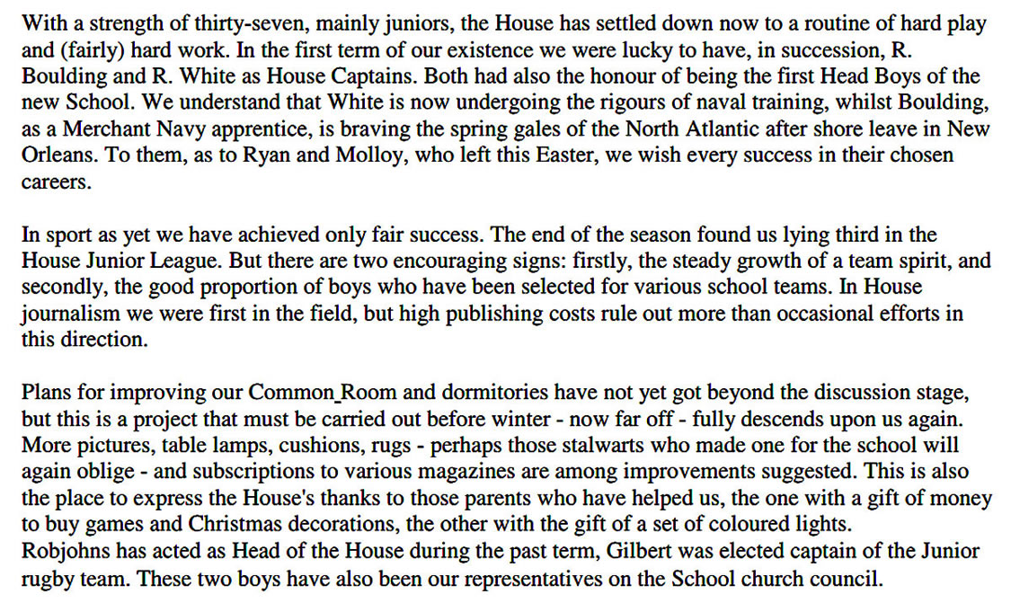 At Christmas, if all goes well, we shall be the first House to move into one of the new buildings. I feel that at this point we shall really become a House in the full meaning of the word, with each member under the same roof and brought in even closer contact with his fellows. But please let us remember that we will be in nissen huts no longer and that the care which these new buildings deserve is equal to that which we should bestow on our own homes; we are privileged to be the first House to enter the new buildings.