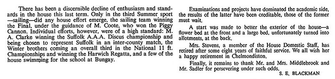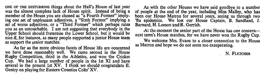 Individuals in the house have deserved well of the school for their services to school teams. Day, Haynes, Thorn and Hansell have played particularly well for their respective rugger teams. Cuffley did well to gain first place in the Javelin throw at the Inter-Schools Athletic Meeting at Northgate School, while Gilbert was the first boy from the school to play for the Suffolk Schools' Cricket XI.