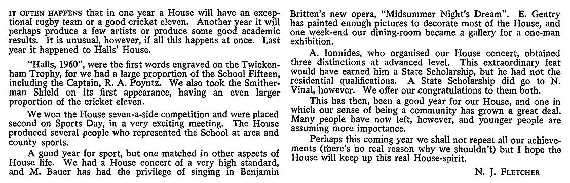 ALL THINGS considered, it has been a good year for Halls House. Academically, results have been very gratifying, but, inevitably, House prestige is not affected by these results to any degree. By and large, the successful House is judged by its prowess on the games field. But here I can safely claim that the House has attained a higher standard, as far as rugby and cricket are concerned, than it has possessed for a considerable time.