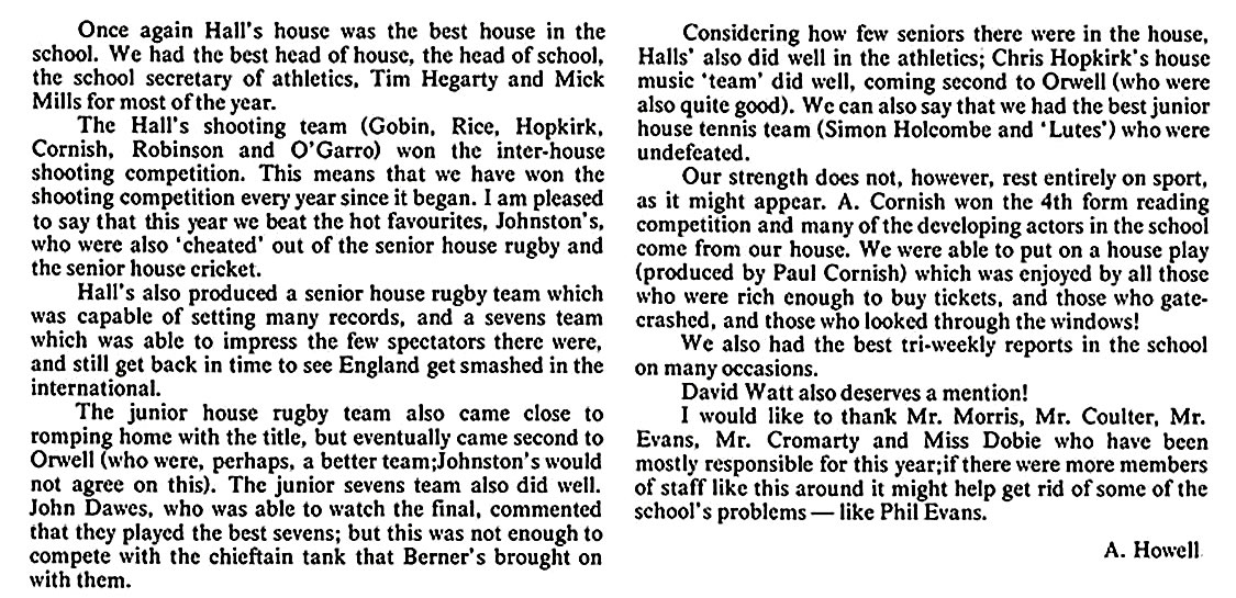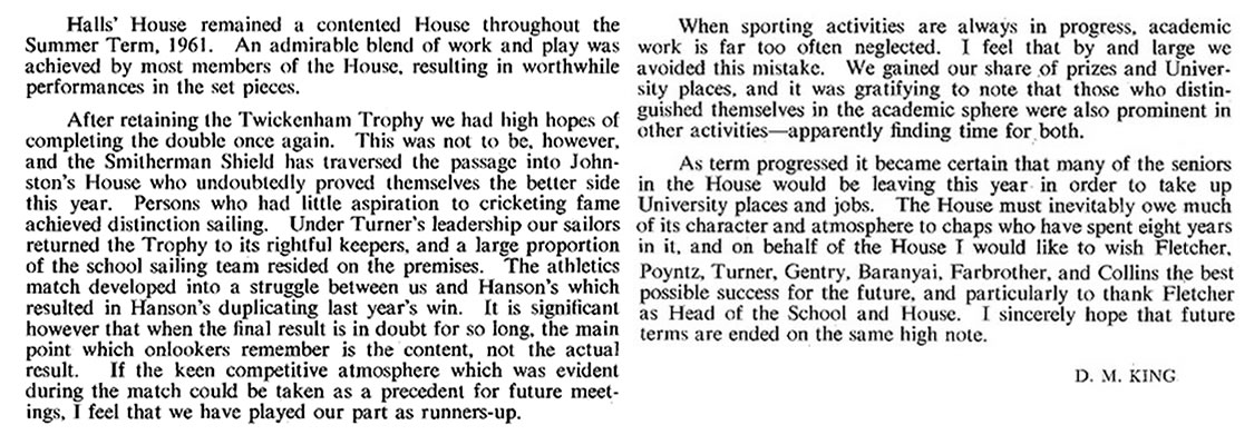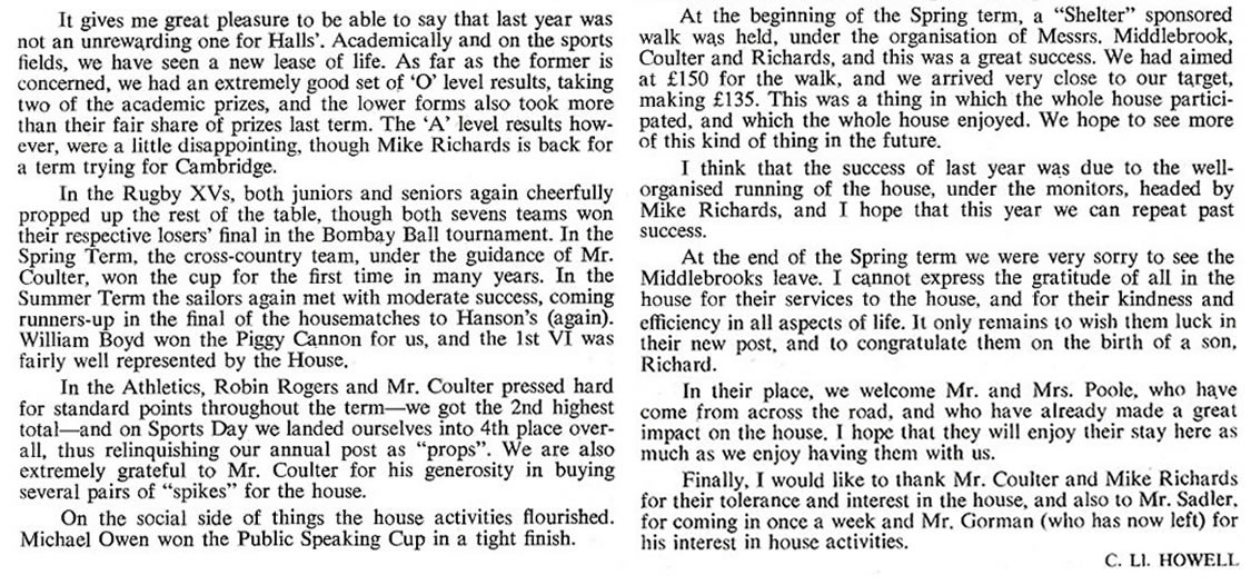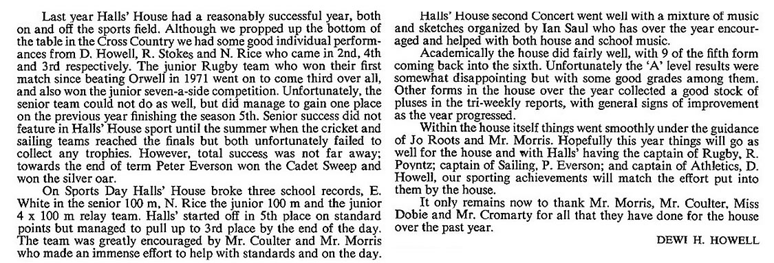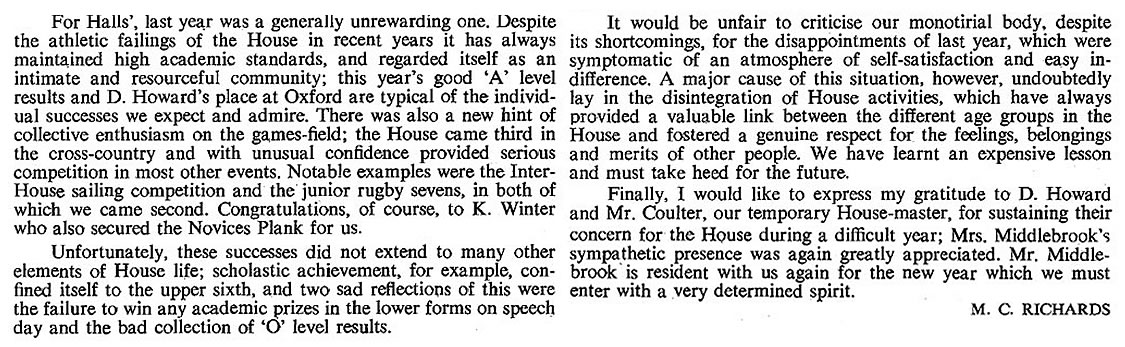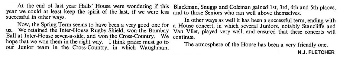 The Sailing Cup again fell to Hall's House, but not without a struggle. I therefore wish to congratulate the team on their achievement. Cross-country running and athletics results did not prove to be as successful as they had seemed to promise, but this will, I am sure, be improved upon during the coming seasons.