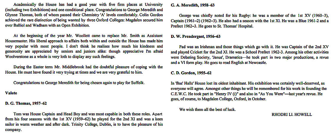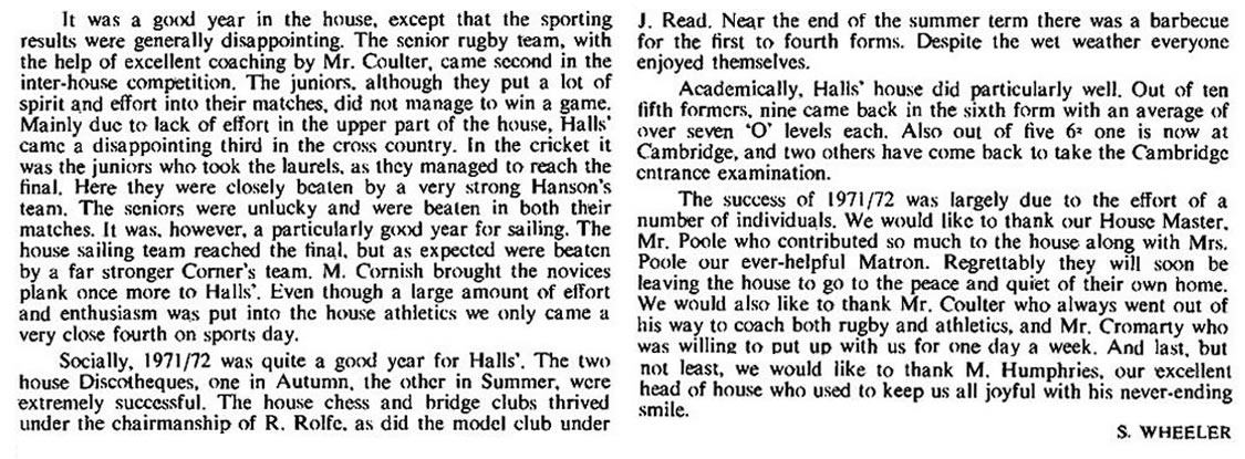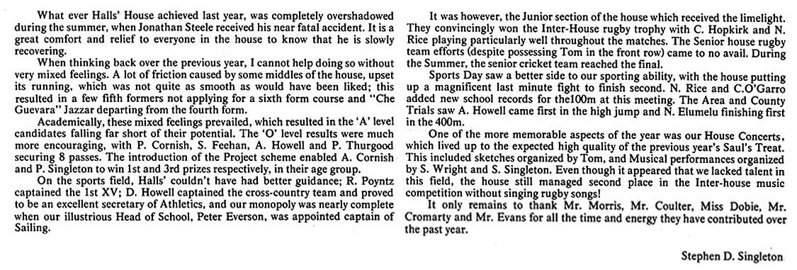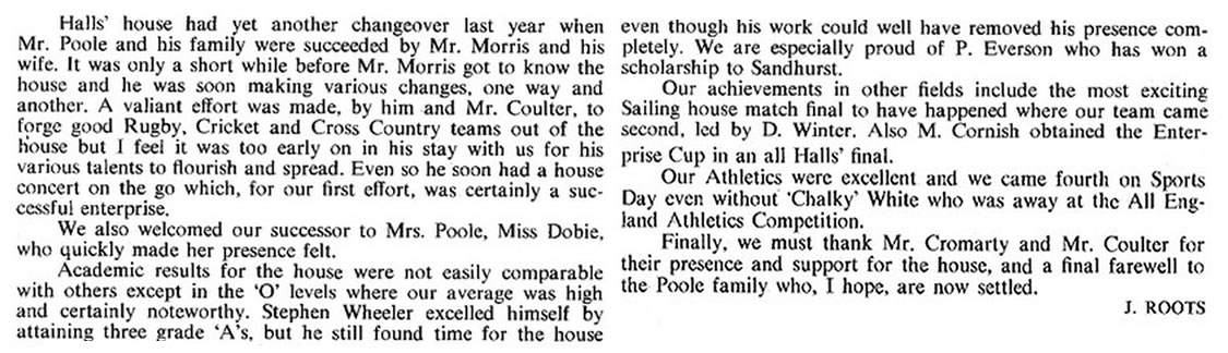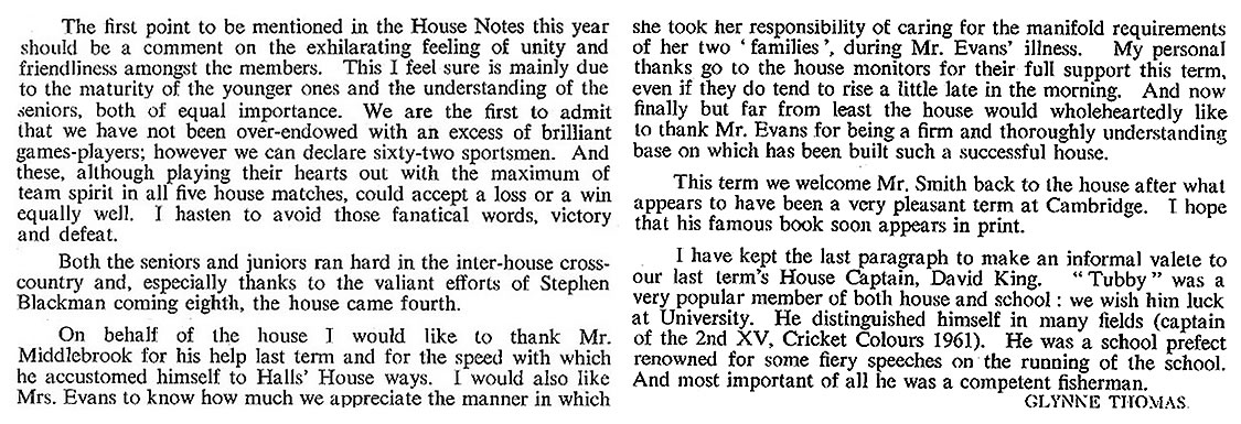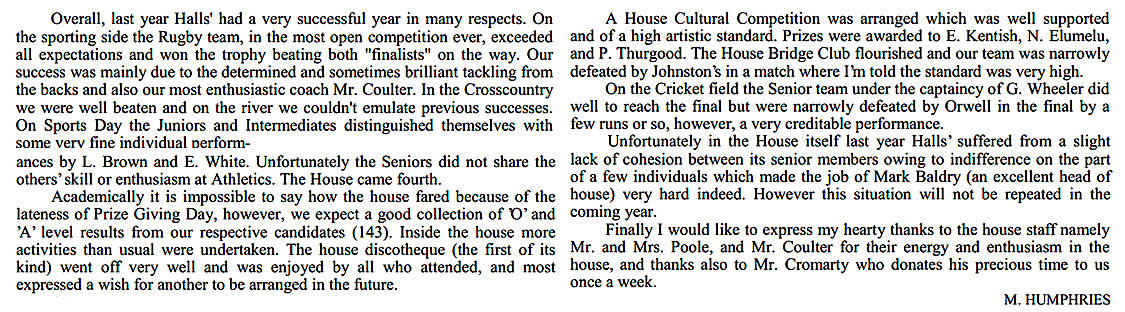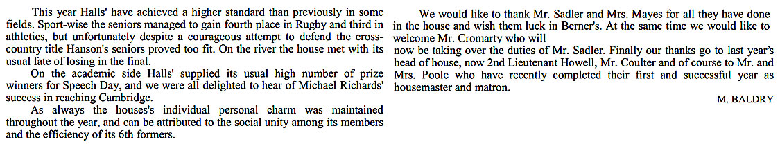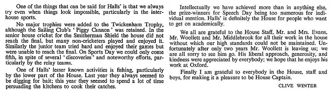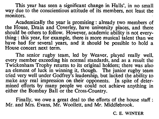 Lastly, Mrs Halls and myself wish to thank you for the many kindnesses and not inconsiderable friendship that you have given us during my two years as Housemaster. We carry many happy memories to Oxford with us - not least, the final tea party at the end of term. We hope to see you all again. Meanwhile, 'God give you good adventure'. |
