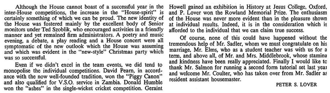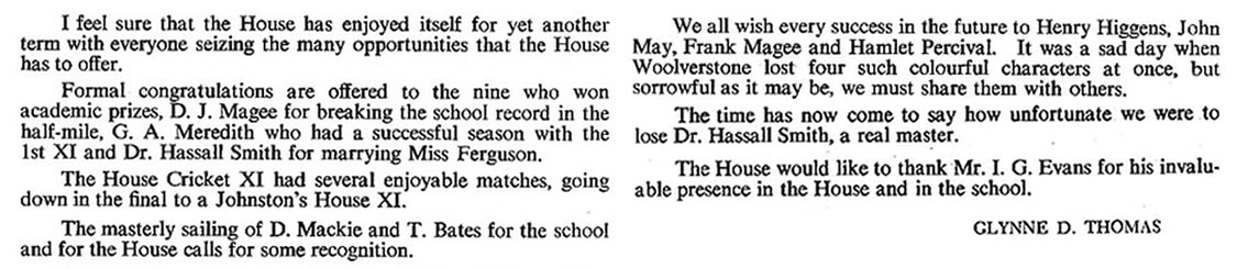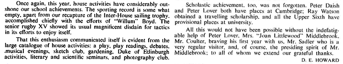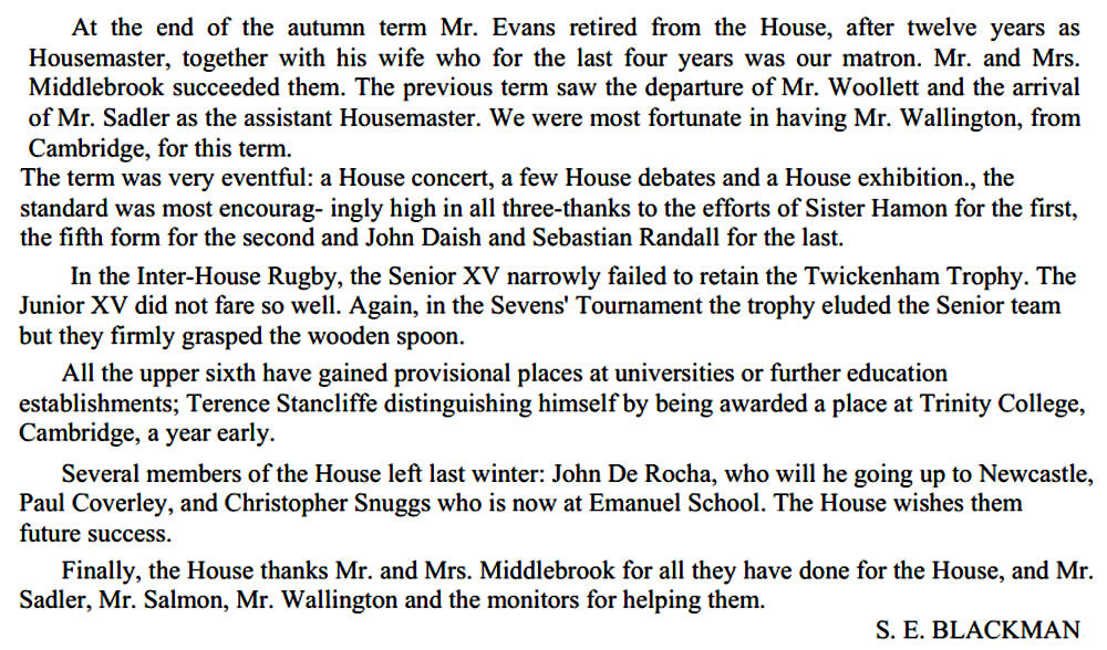 Trying to capture the family atmosphere in a school "house" which is accommodated in several separate and temporary buildings, spread around the school grounds, has not been an easy matter; thus it is all the more credit to us that, during the past year, despite the physical difficulties, the sense of fellowship and house loyalty has grown and prospered.