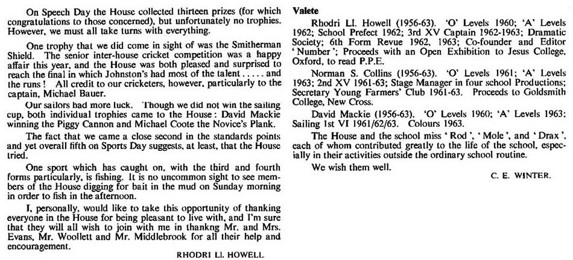 As is probably the case in other Houses, our Sixth Form has changed considerably, the normal intake of Fifth Formers being swelled by the addition of six Fourth Formers. Both Forms are to be congratulated on their extremely good G.C.E. results. Four former Third Formers are also to be congratulated on their jump into the Fifth Form. The overall picture appears to he one of good academic progress. Cox's departure left the House without any Blues or Prefects, but since then three Blues and one Prefect have been appointed, which makes us equal with the other Houses.