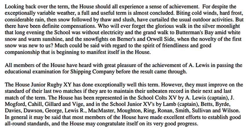On Speech Day, the House was very proud to see Begg, Davies and Lamb receive prizes for achievements in their academic work of the past year. Each is to be heartily congratulated on his success.