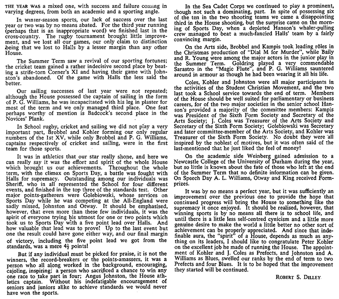 Academically, the House continues to enjoy moderate success, and on Speech Day D. Begg, Dye, Kohler and J. Coles all received prizes. Five Fifth Formers and seven Fourth Formers, who did extremely well in the G.C.E. examinations, joined the Sixth Form this term.