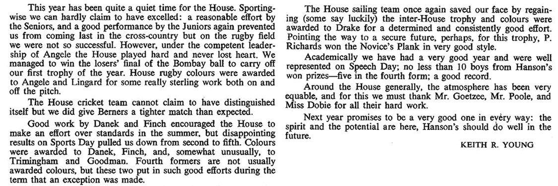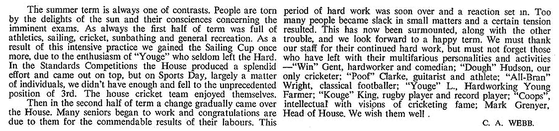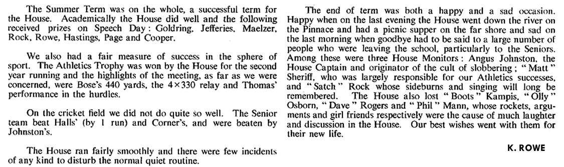 THE PAST YEAR has been one of mixed success for the House: having tasted the bitterness of defeat in Inter-House Rugby, our teams hit back to carry off both the Athletic and Cricket trophies in a most convincing manner.