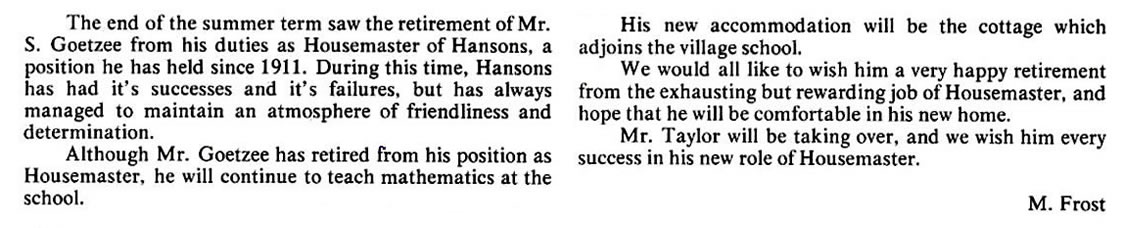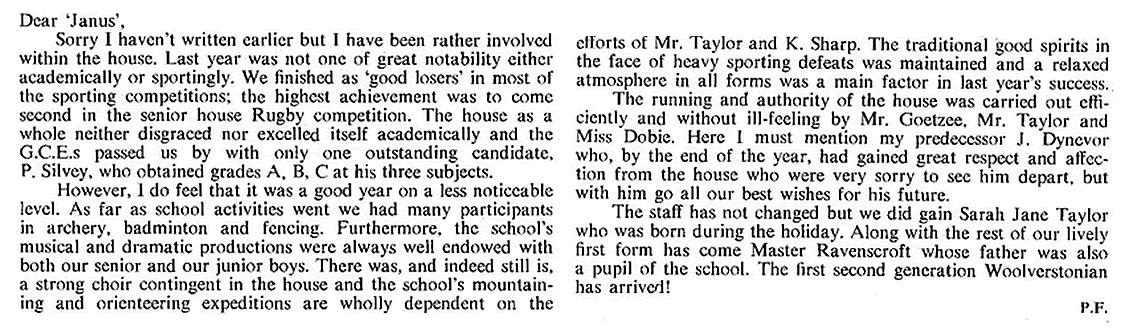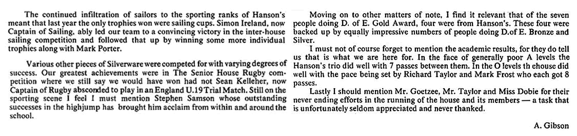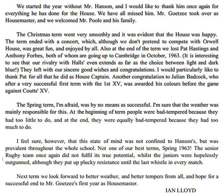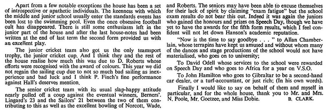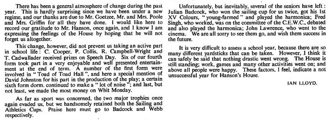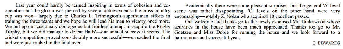 2) I had hoped to add a definitive list of staff and captains, and have put in the names where I can. However, it is impossible to be sure about the staff, particularly the Assistant Housemasters & Matrons - and the names of most Sports Captains remain to be added by someone. As for House Captains, I have assumed that the authors of the House Reports were the House Captains - but I could be wrong of course ....