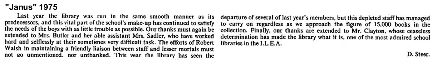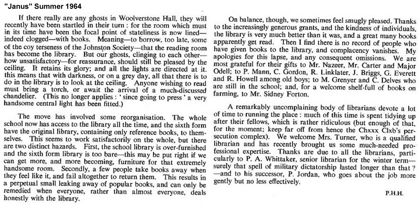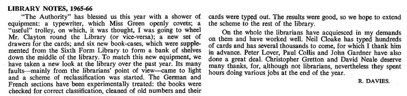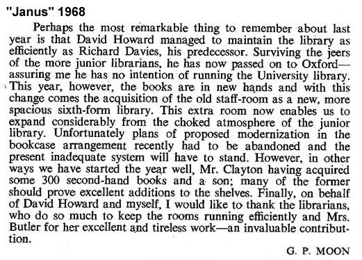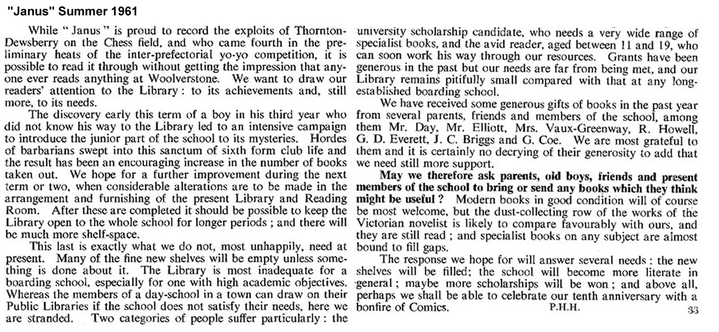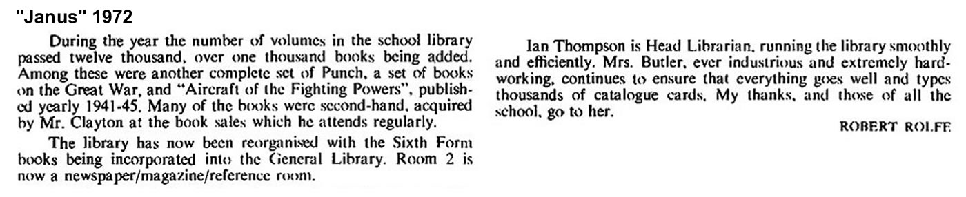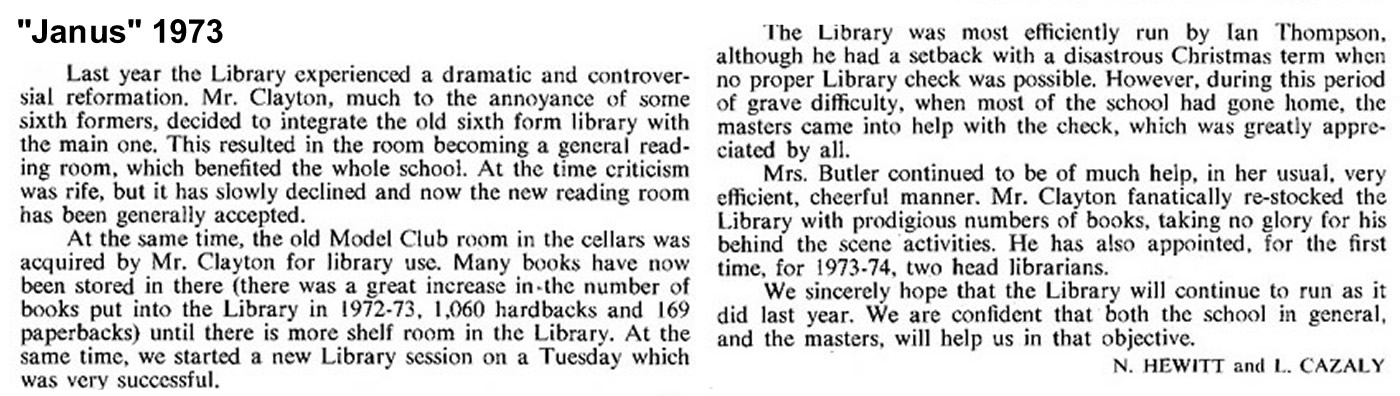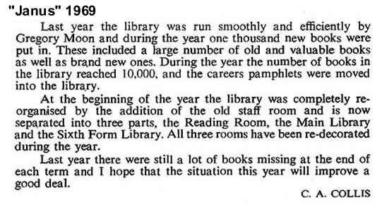 1955: AUTUMN - Senior Librarian: G. Bicknell - Librarians: W. Bauer, A. Green, J. Hansell, A. Jones, V. Shreeve - Assistant Librarians: C. Boyd, J. Dye, D. House, W. Mathews, A. Szepesy. For the first month of this term the library has been, unfortunately, closed because the shelves, so necessary for the increased volume of books, did not arrive. However, the shelves have finally arrived, and the library has been able to function properly again. The new system of having two library rooms, one for books of educational value, and one for the lighter fiction, seems to be working quite well, and has been continued. Along with the growth of the school, the library has greatly expanded. We now have a wide selection of reading matter on both the fiction and non-fiction shelves. We have over 2,500 books in the library, and we are entering a further fifty every week. 1953 SPRING: Librarians: B. L. BASS - G. R. BICKNELL - R. COX - N. GOULD - D. C. HARRINGTON - F. W. MOUGHTON Much progress has been made in the Library during the winter. The arrival of more books and new shelves have enabled us to form bays, which give the room a more studious and secluded atmosphere, and curtains have added to the feeling of comfort. The librarians have been kept busy by the intake of books, now numbering fifteen hundred, and the preparation of card indexes, which are at last ready for use. As the quantity of books on each subject increases, serious use of the Library will in fact become almost impossible without help of the index. The casual handling of books still gives cause for worry. £200 was spent last year on new books alone, without mentioning furniture and magazines. This is fine. But how are they treated when they are put into the shelves? A book can stand only a small amount of rough treatment - of being left about, kicked around, lost for a while in the ferns, let us say - before it falls to pieces and becomes useless. Rebinding nowadays is very expensive. So these books have got to last. That is up to the people who use them. |