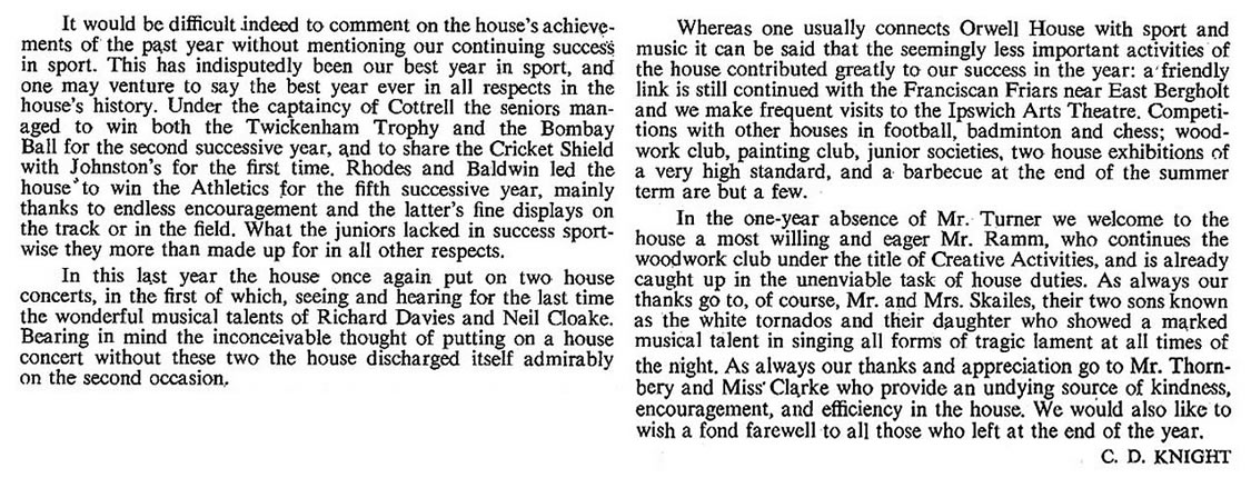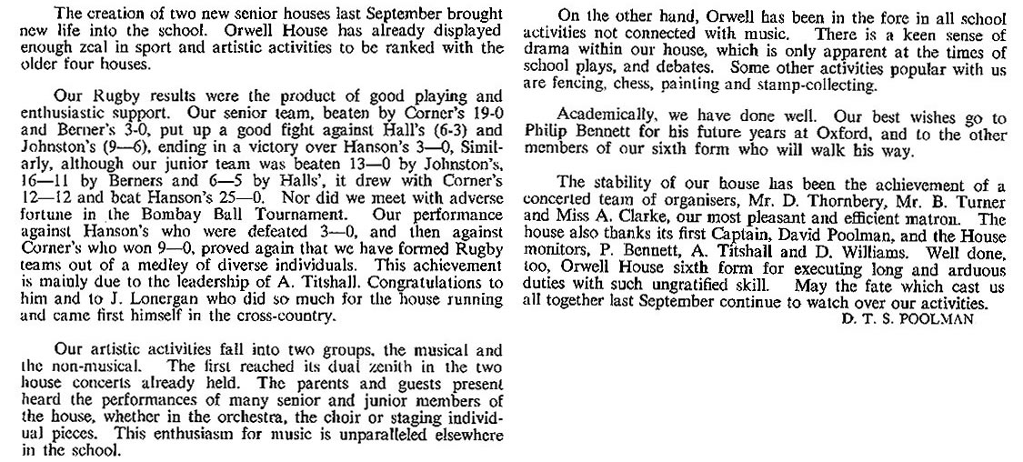 | SINCE THE last account of this House was written many things have changed. While all the other Houses were in their new buildings we, however, remained in our Nissen huts which still bring back pleasant memories. In the second term the Junior House was reconstructed. We moved into our long awaited new House taking half the First and Second Forms, the remainder of the First Forms starting a second Junior House becoming known as "Berners". After a proposal that our House should be known as "Mudlarks" had been rejected we took upon ourselves the name of "Orwell". When we moved in, the seniors were Markham and Dye of Hanson's and Wilds and Pinney of Corner's. In the Summer Term, Markham left our House and Golebiowski took his place. Afterwards Pinney soon followed him, and Bicknell became a Senior. Mr. Mudd's model aeroplane craze soon converted our peaceful abode into a screaming aerodrome. Several of the members of the House have represented their separate Houses in both Rugby and cricket, while a few have produced one or two shows. On Open Day, our hydrogen balloon idea brought in a large amount of money, which helps towards a swimming pool. We were very sorry to see Mr. Cowdrey and Miss Lockyer go, and we wish them all the best. On the whole it has been a fruitful year .