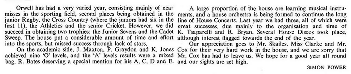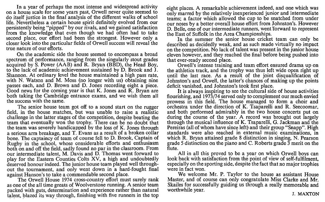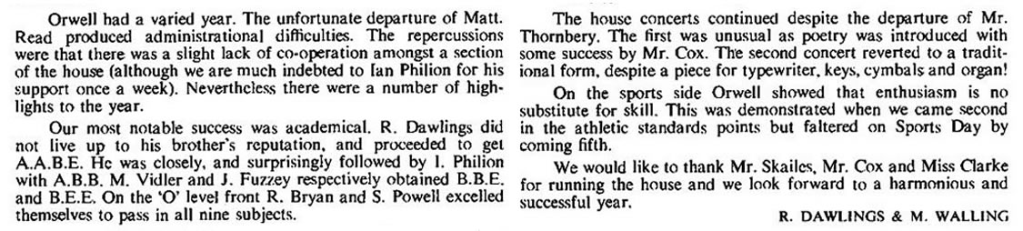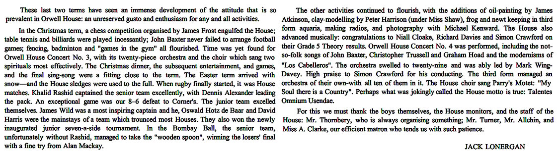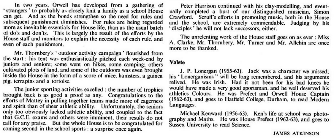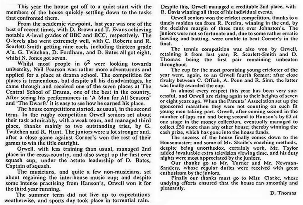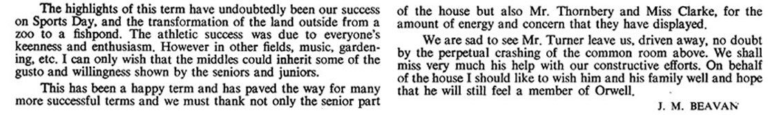 familiar with two Housemasters of Orwell: Fred Mudd and Derek Thornbery. I believe Fred left a fine legacy for Derek T. to take over