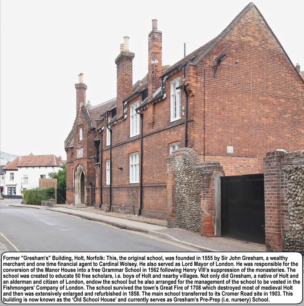 Gresham’s School is an independent coeducational boarding school in Holt in Norfolk, England.The school was founded in 1555 by Sir John Gresham, who converted Holt’s Manor House into a Free Grammar School as a result of Henry VIII’s suppression of the Monasteries. The founder left the school's endowments in the hands of the Worshipful Company of Fishmongers of the City of London, who are still the school's trustees. It survived the Great Fire of 1708 which destroyed most of medieval Holt and was extensively enlarged and refurbished in Victorian times. Renamed ‘Old School House’ it currently serves as home to the Pre-Prep School. In the 1890s, an increase in the rental income of property in the City of London led to a major expansion of the school, which under the direction of a new and innovative headmaster, George Howson built many new buildings on land it owned on the eastern edge of Holt, including several new boarding houses as well as new teaching buildings, library and chapel. The Senior School and Prep School are presently located along both sides of Cromer Road on the eastern edge of Holt.